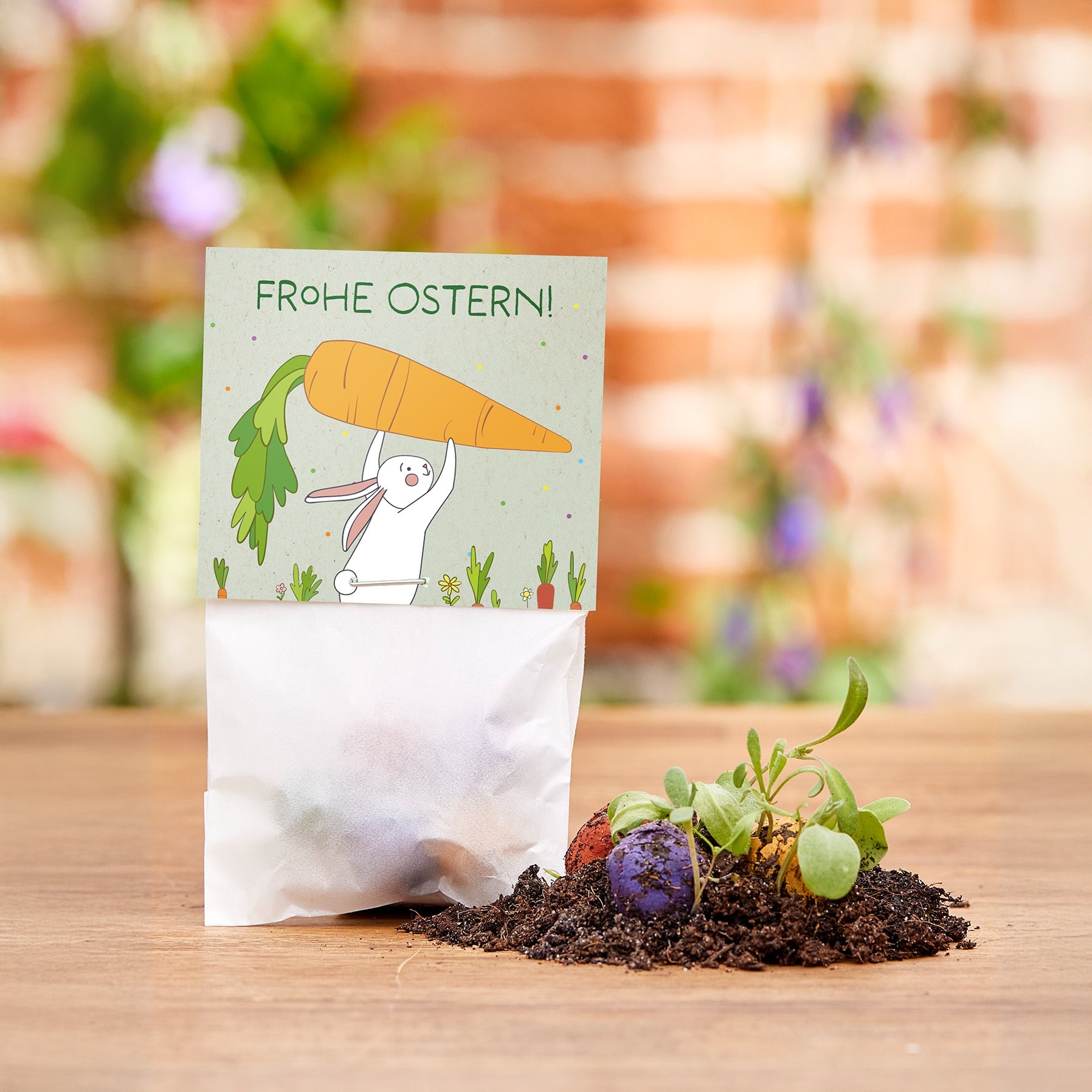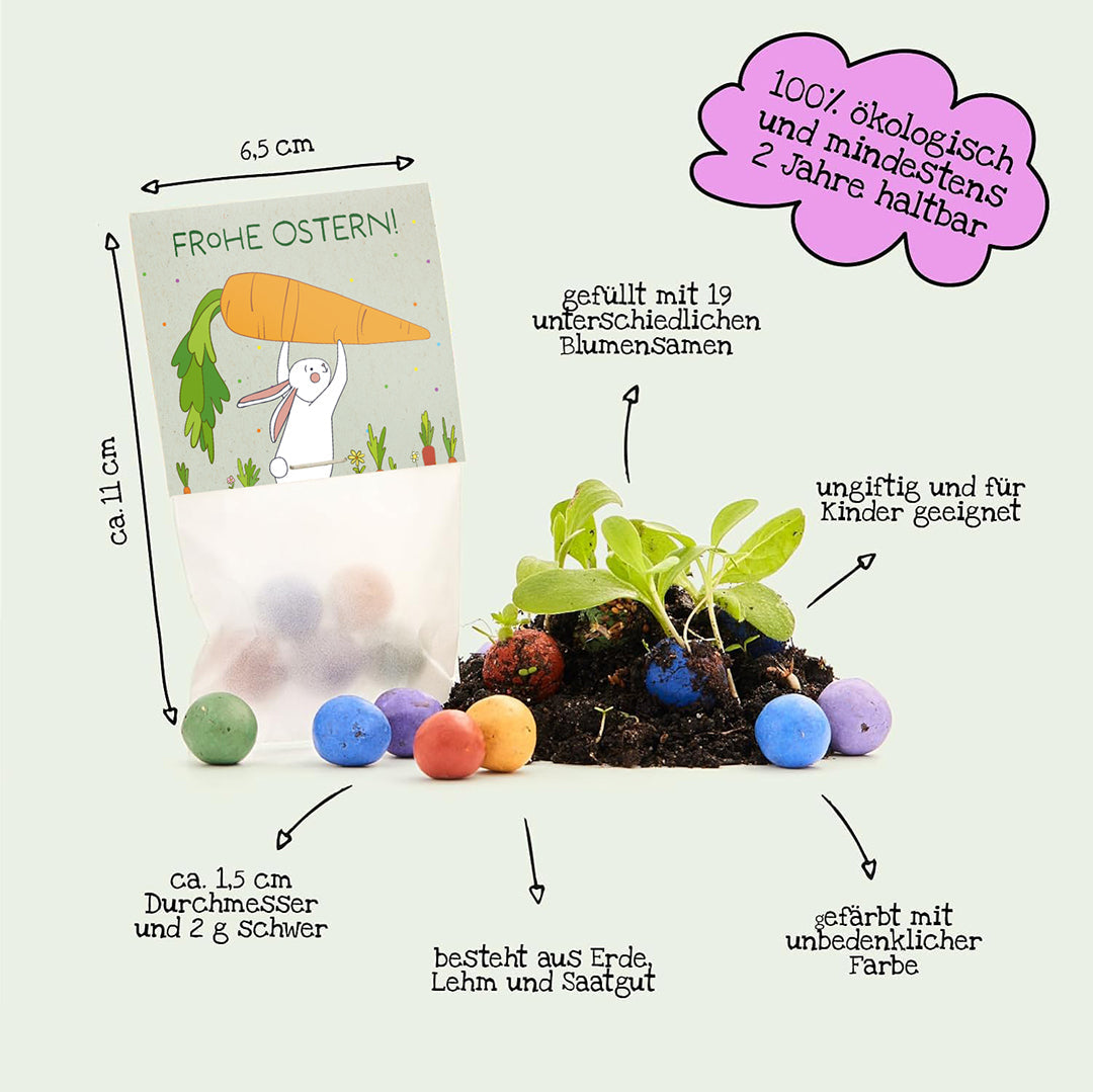 Kreatives Ostergeschenk: Enthält 10 im Osterdesign gestaltete Tütchen, gefüllt mit je 5 bunten Saatkugeln, aus denen Wildblumen wachsen. Das ideale Ostergeschenk für Kinder, Freunde und Kollegen, auch eine tolle Zugabe zum Osternest.