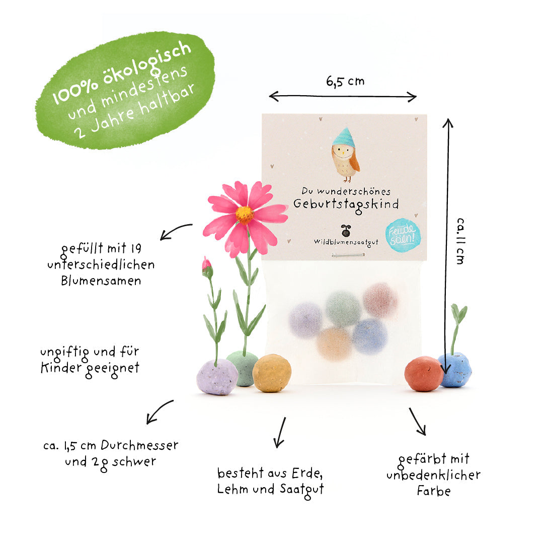 Blühendes Abenteuer für Geburtstagskinder: Einfach einpflanzen, gießen und staunen: Aus den farbenfrohen Saatkugeln wachsen heimische Wildblumen – ein spannendes Naturerlebnis für große und kleine Geburtstagskinder, das auch nach dem Fest noch begeistert.