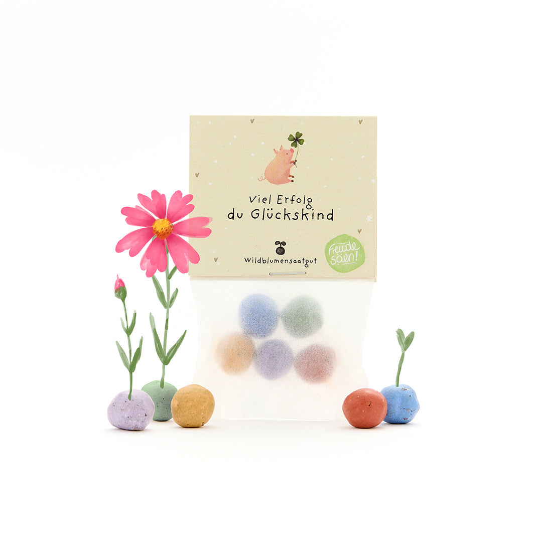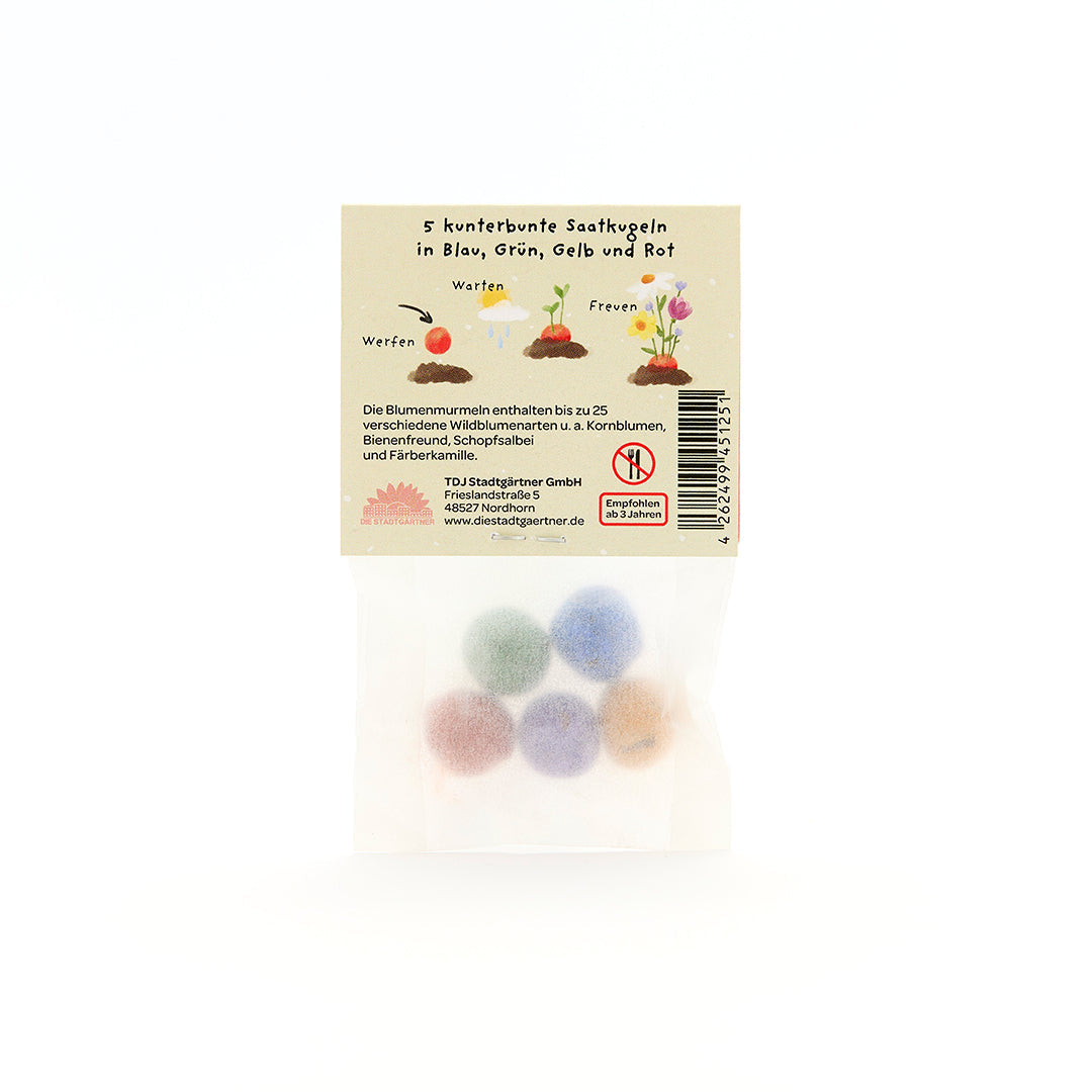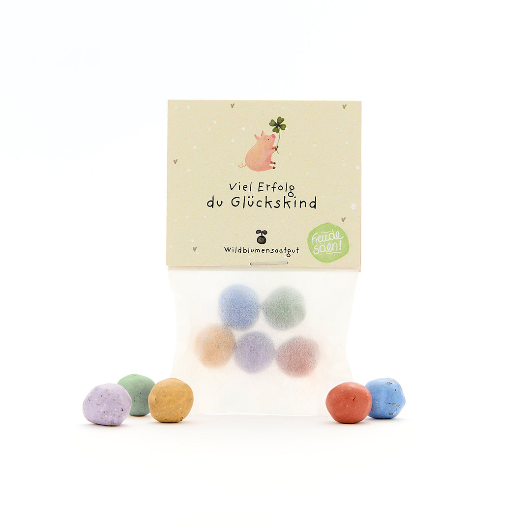 Nachhaltiges Schenken mit positiver Botschaft: Die Blumenmurmeln enthalten Wildblumensaatgut und sind plastikfrei verpackt. Einfach auswerfen, gießen und gemeinsam mit dem Glück auch bunte Blüten sprießen lassen – ein Geschenk, das bleibt und erblüht.