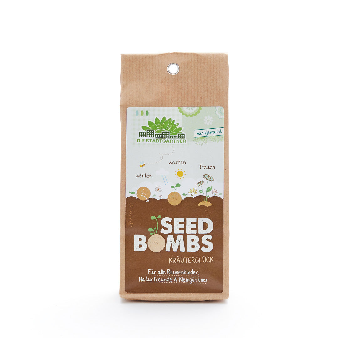 5 handgemachte 'Kräuterglück'-Samenbomben. Jede Samenbombe enthält eine bunte Mischung aus Anis, Beifuss, Dill, Gewürzfenchel, Echter Kamille und Wiesenkerbel.