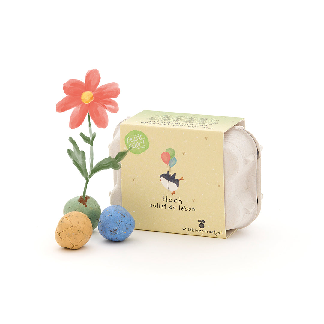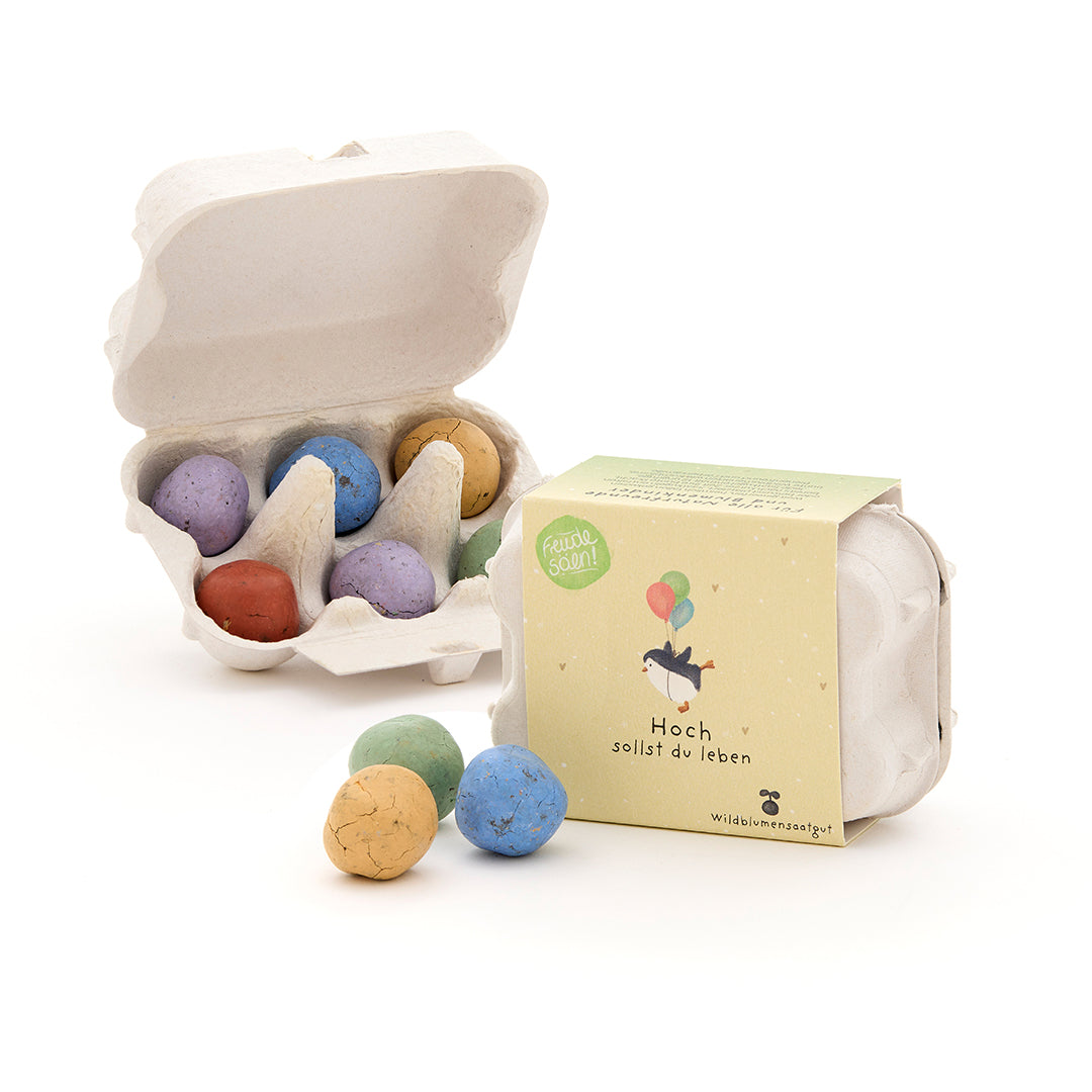Wachsendes Geschenk zum Geburtstag: Die 6 bunten Blumenmurmeln im Mini-Eierkarton enthalten Wildblumen-Saatgut und einen liebevollen Geburtstagsgruß – eine originelle Geschenkidee zum Geburtstag.