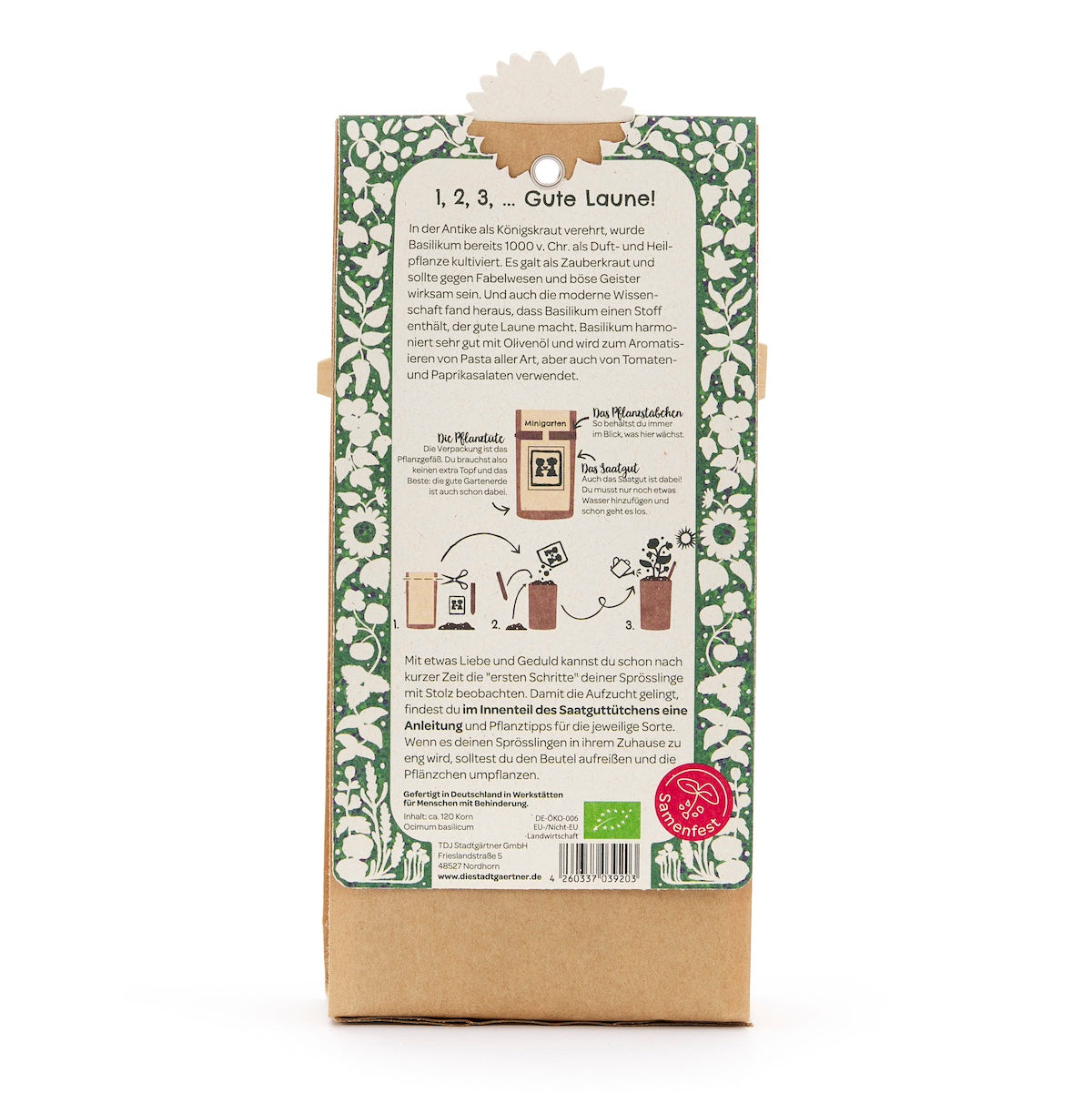 Alles-in-einem Anzuchtset: Enthält keimfreudiges BIO-Saatgut für Basilikum, beste Anzuchterde, ein passendes Pflanzstäbchen bzw. Beetmarkierer und eine wasserfeste Verpackung, die als Pflanzgefäß genutzt wird. Mit der ausführlichen und anfängerfreundlichen Anleitung funktioniert die Anzucht kinderleicht!