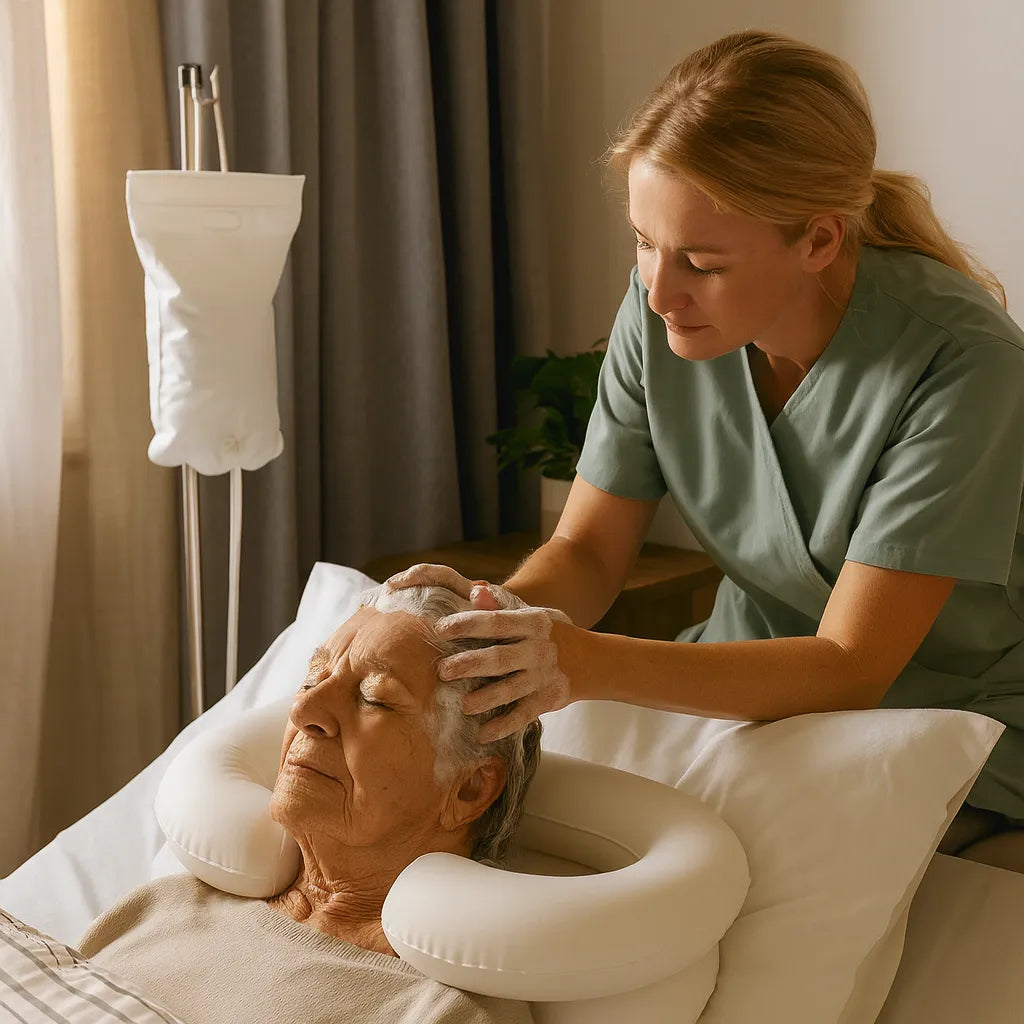Das aufblasbare Waschbecken AT51033 bietet eine komfortable und hygienische Lösung für die Haarwäsche bei bettlägerigen Personen oder im professionellen Einsatz – etwa in Friseursalons, Rehakliniken oder der häuslichen Pflege. Es erspart mühsames Umlagern und bietet angenehme Unterstützung für Kopf und Nacken. Ideal für Personen mit eingeschränkter Mobilität oder zur flexiblen Nutzung unterwegs.