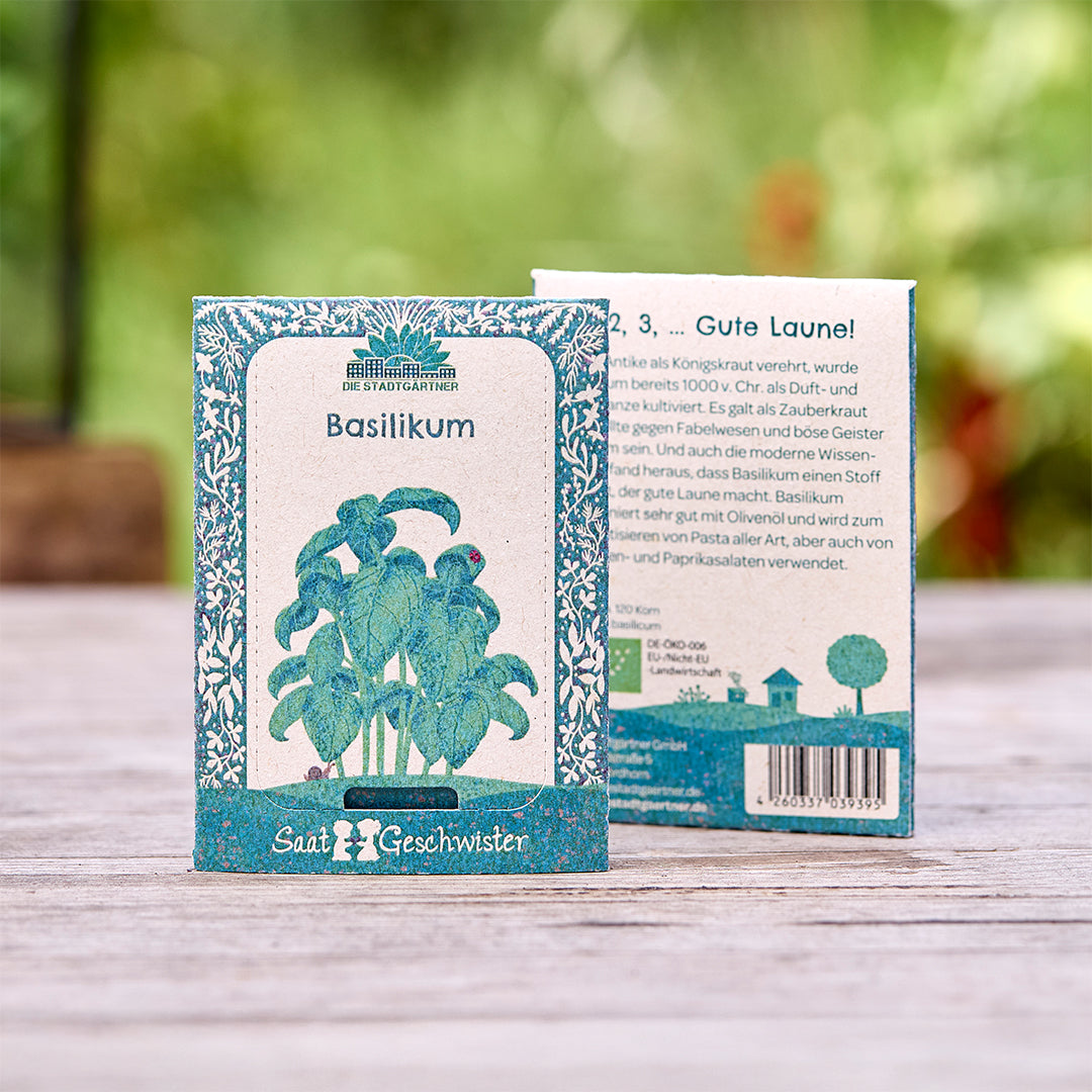 Nachhaltig: Die liebevoll gestaltete Verpackung besteht aus umweltfreundlichem Zuckerrohrpapier – perfekt für umweltbewusste Hobbyköche und Gärtner. Basilikum gedeiht ideal im Garten, auf dem Balkon oder auf der Fensterbank und bringt mediterranes Flair in jedes Zuhause.