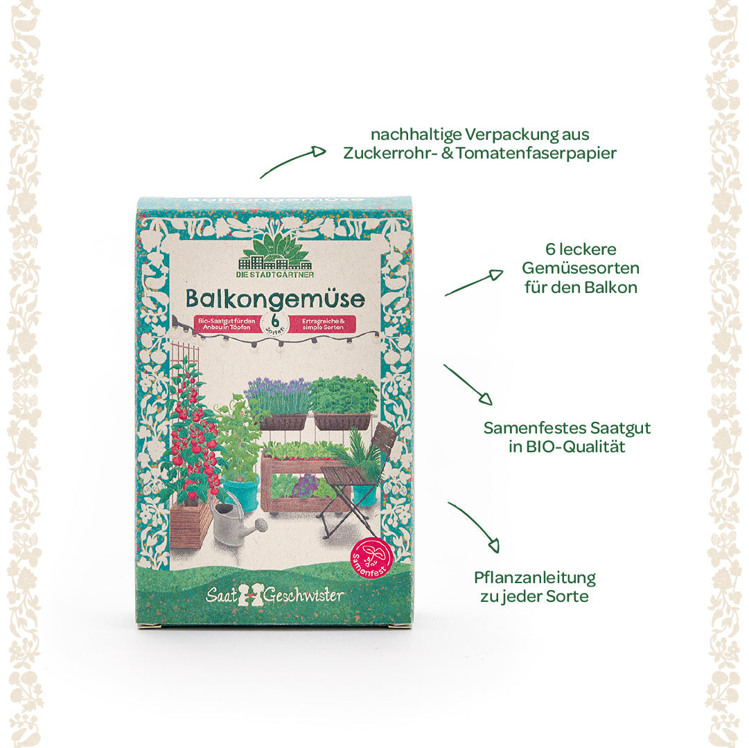 HOCHWERTIG: Für unser Saatgut-Set Balkongemüse verwenden wir ausschließlich hochwertiges Saatgut in BIO-Qualität. Die Verpackung besteht aus nachhaltigem Zuckerrohrpapier. Sie sieht nicht nur toll aus, sondern eignet sich auch optimal zur Aufbewahrung des Saatguts.