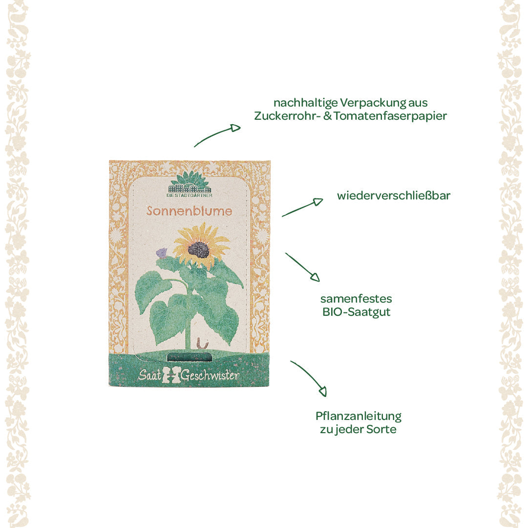 Samenfest, BIO & nachhaltig verpackt: Das hochwertige Saatgut stammt aus kontrolliert biologischem Anbau und wird in einer liebevoll gestalteten Verpackung aus Zuckerrohrpapier geliefert. Perfekt für Garten, Hochbeet oder Balkon – ein Highlight für jeden Außenbereich.