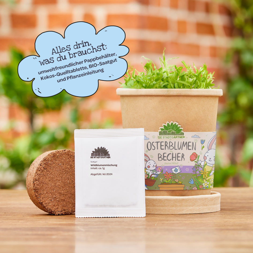 Nachhaltiges Geschenk zu Ostern: Dieses liebevoll gestaltete Anzuchtset sorgt nicht nur für strahlende Gesichter beim Beschenkten, sondern leistet auch einen wichtigen Beitrag für Bienen und andere Insekten. Ein Geschenk, das Natur und Osterfreude verbindet.