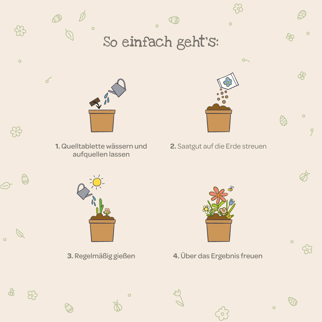 Frühling leicht gemacht: Einfach Quelltablette aufquellen lassen, Saatgut aussäen und gießen – bald sprießen farbenfrohe Frühlingsblumen. Perfekt als Osterdeko oder Geschenk fürs Osternest!