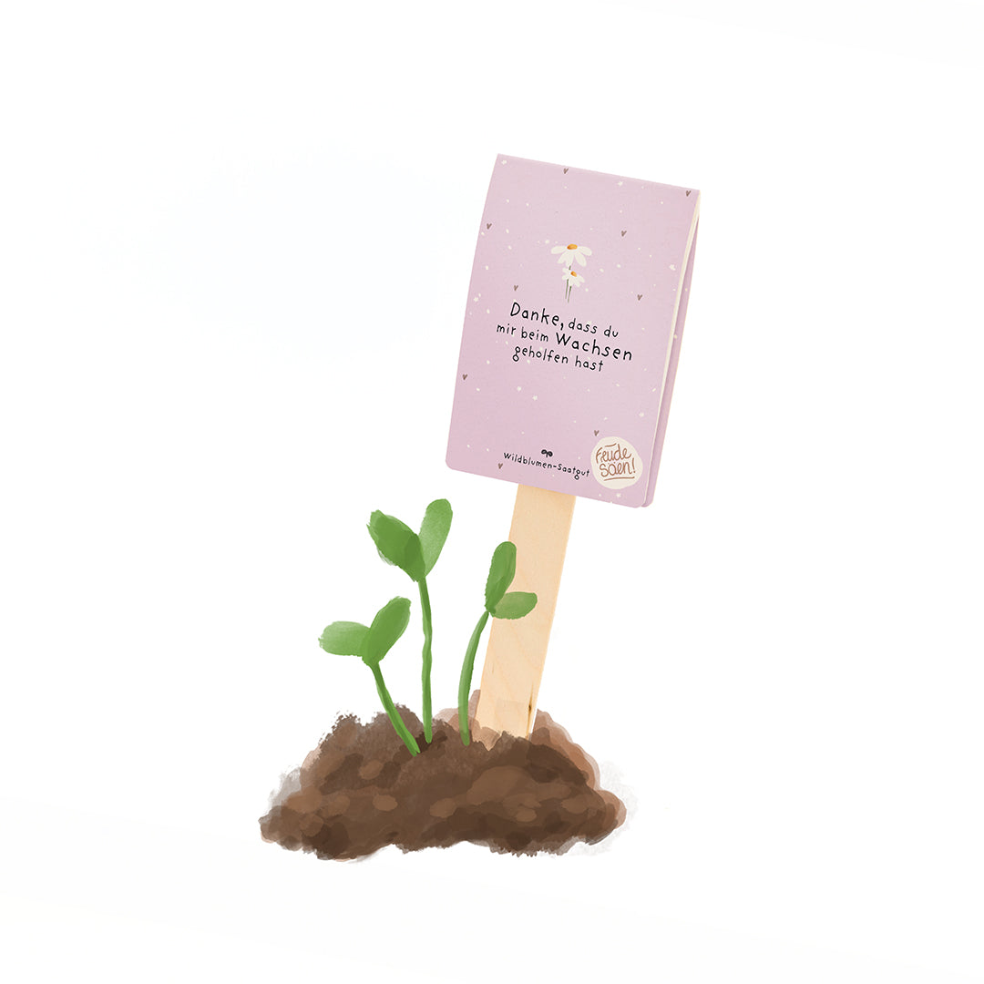 Ein besonderes Dankeschön: Dieser kleine, liebevoll gestaltete Saatgruß sagt auf besondere Weise Danke. Er enthält Wildblumen-Saatgut und wird beim Einpflanzen zu einem Symbol für Entwicklung, Fürsorge und gemeinsame Schritte. Auf der Rückseite ist Platz für deinen Namen und den der beschenkten Person – so wird daraus ein ganz persönlicher Gruß.