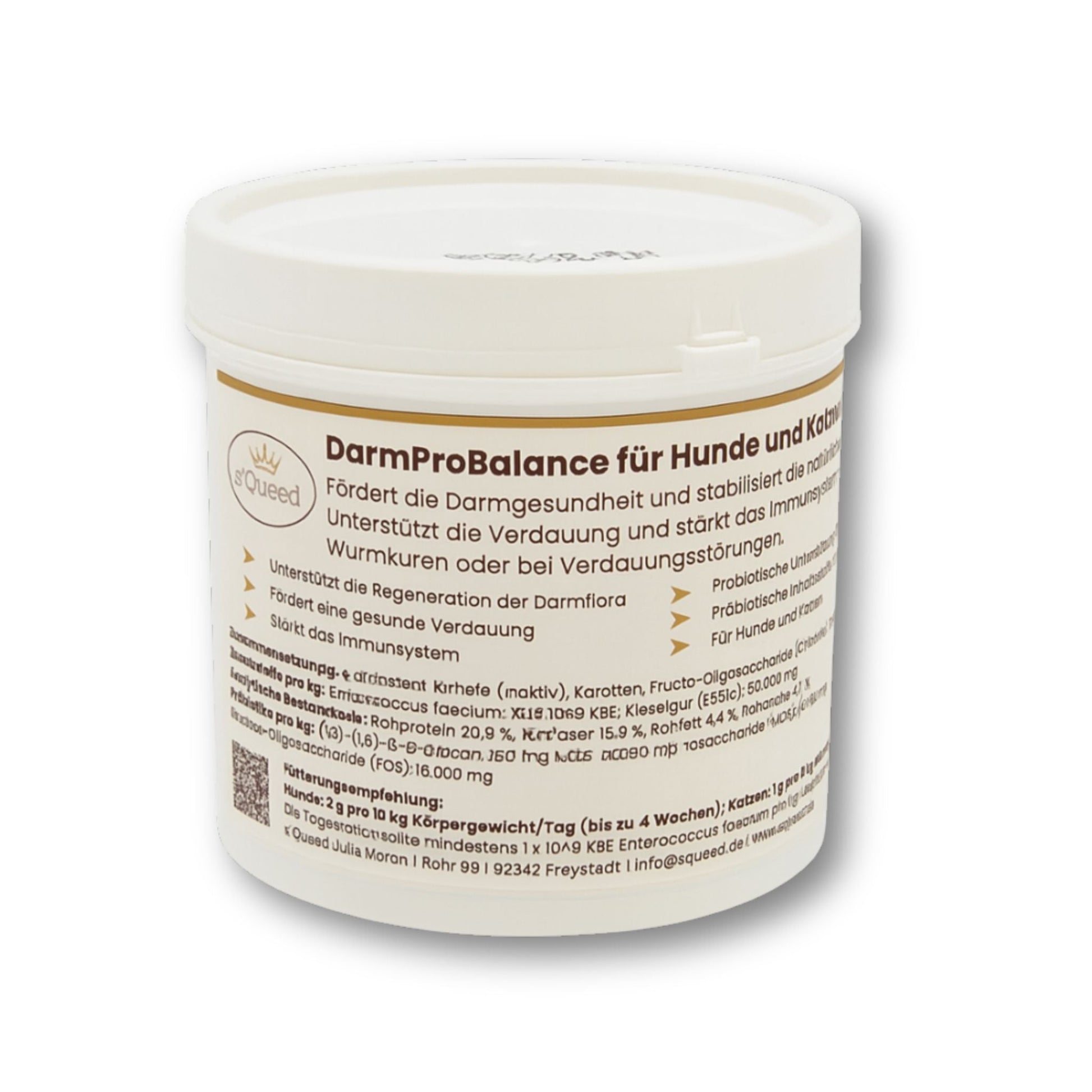 s’Queed DarmProBalance ist ein hochwertiges Diät-Ergänzungsfuttermittel, das gezielt entwickelt wurde, um die natürliche Darmbalance bei Hunden wiederherzustellen – mit einer kraftvollen Kombination aus probiotischen Bakterien und ausgewählten präbiotischen Pflanzenstoffen.