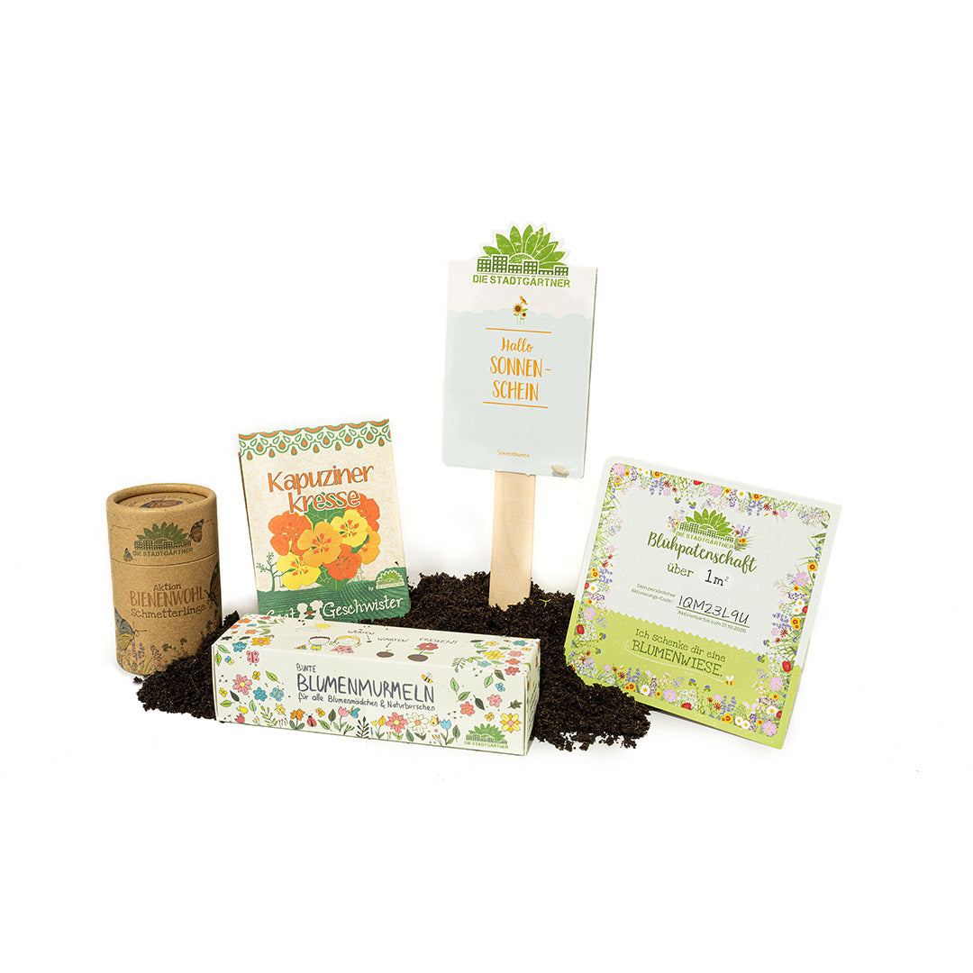 Das Osterset für alle, die es bunt mögen! In diesem schönen Set ist alles drin, was man für einen fröhlich-bunten Garten oder Balkon braucht: Saatgut für 30 qm Schmetterlingswiese, bunte Blumenmurmeln, ein Saatgruß, Kapuzinerkresse und ein Gutschein über 1 qm Blühpatenschaft. Das perfekte Ostergeschenk für die ganze Familie!