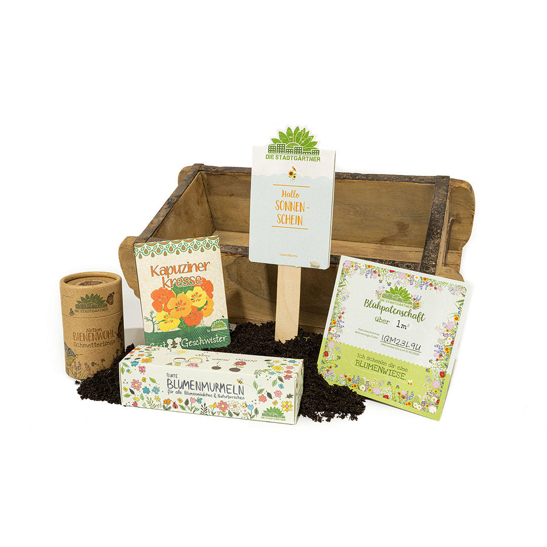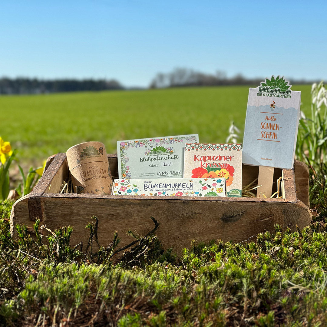 Das Osternest für alle, die es bunt mögen! In diesem schönen Set ist alles drin, was man für einen fröhlich-bunten Garten oder Balkon braucht: Saatgut für 30 qm Schmetterlingswiese, bunte Blumenmurmeln, ein Saatgruß, Kapuzinerkresse und ein Gutschein über 1 qm Blühpatenschaft. Das alles gibt’s in einer wunderschönen Ziegelform – das perfekte Ostergeschenk für die ganze Familie.