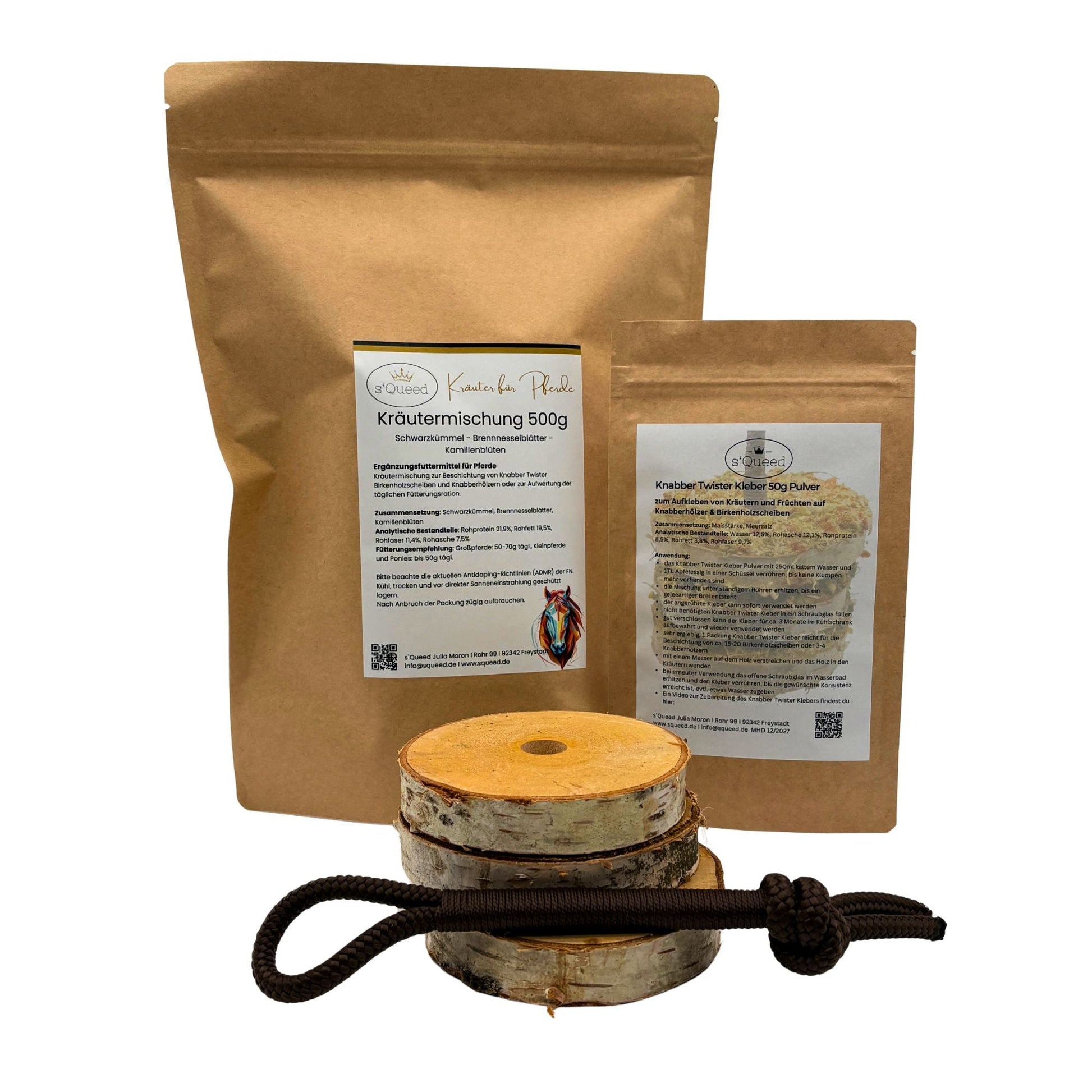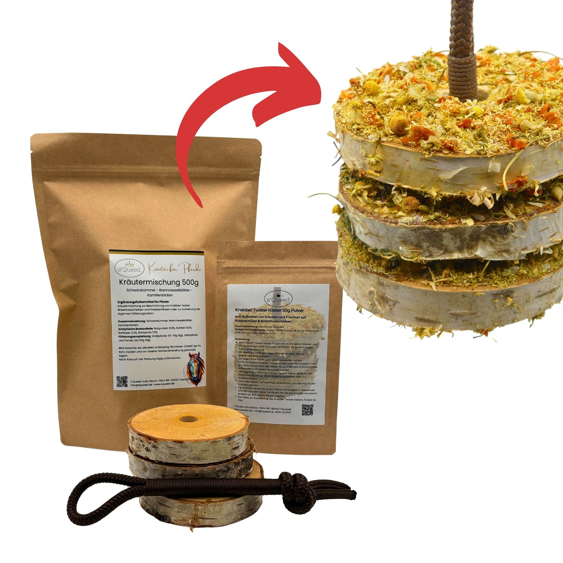 Wähle ganz einfach aus unseren sorgfältig zusammengestellten Kräutermischungen deinen Favoriten aus, um dein individuelles Knabberspielzeug selbst zu gestalten: Birkenholzscheiben und ein Aufhängkern, sowie unser innovativer, einfach anzuwendender Knabber Twister Kleber sind fester Bestandteil des DIY Knabber Twister Spielzeug Sets . Mit unseren sorgfältig ausgewählten Kräutermischungen deiner Wahl kannst du das Spielzeug genau an die Fähigkeiten deines Pferdes anpassen. Das Beste: Die Materialien lassen sich jederzeit neu beschichten, sodass dein Pferd jeden Tag aufs Neue knabbern, spielen und sich beschäftigen kann.