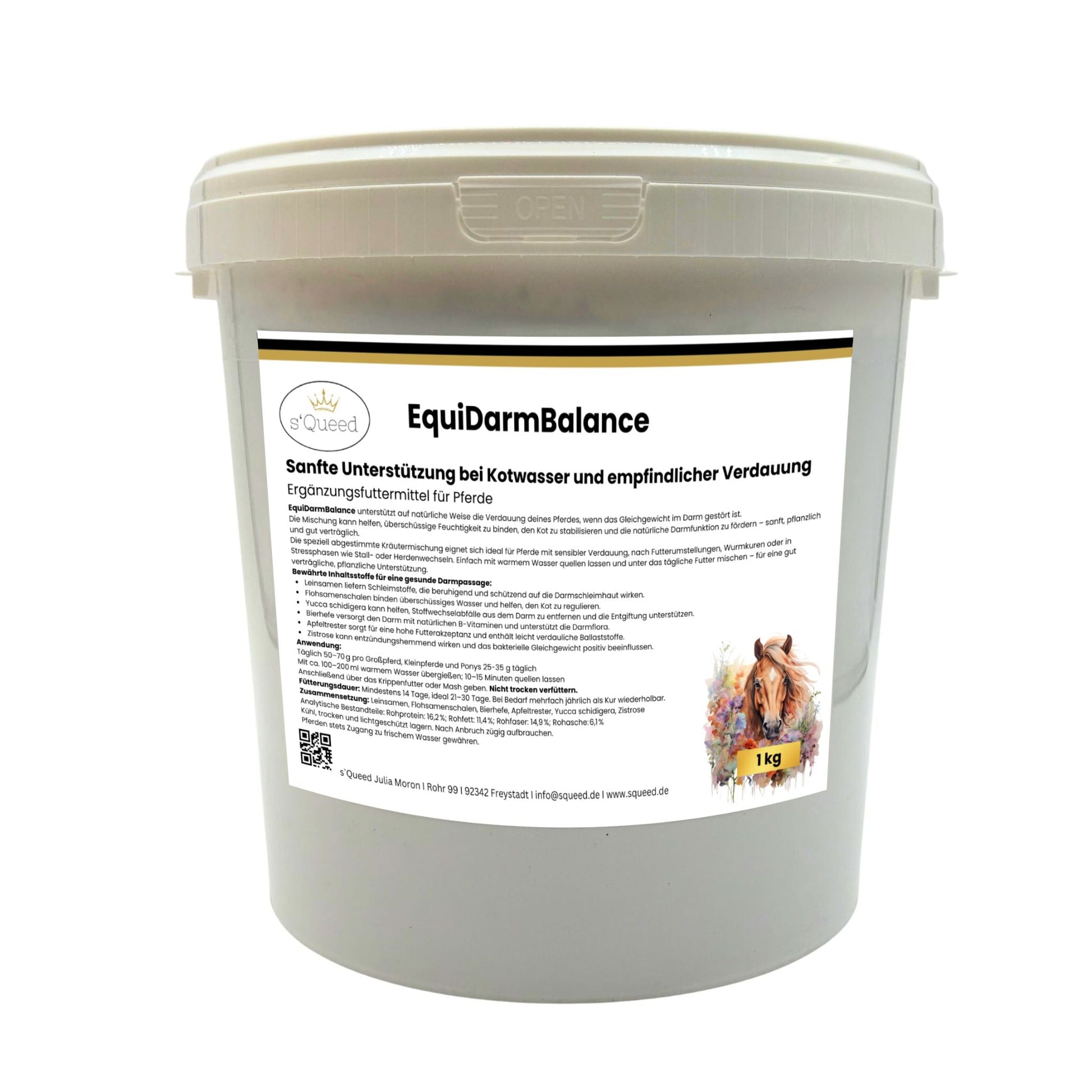 EquiDarmBalance ist die erste 360°-Kräuterkur gegen Kotwasser beim Pferd, die unterstützt, gleichzeitig überschüssige Feuchtigkeit im Darm zu binden, die Kotbeschaffenheit zu verbessern, das bakterielle Gleichgewicht zu fördern und die Darmschleimhaut zu schützen – natürlich, effektiv und verträglich.