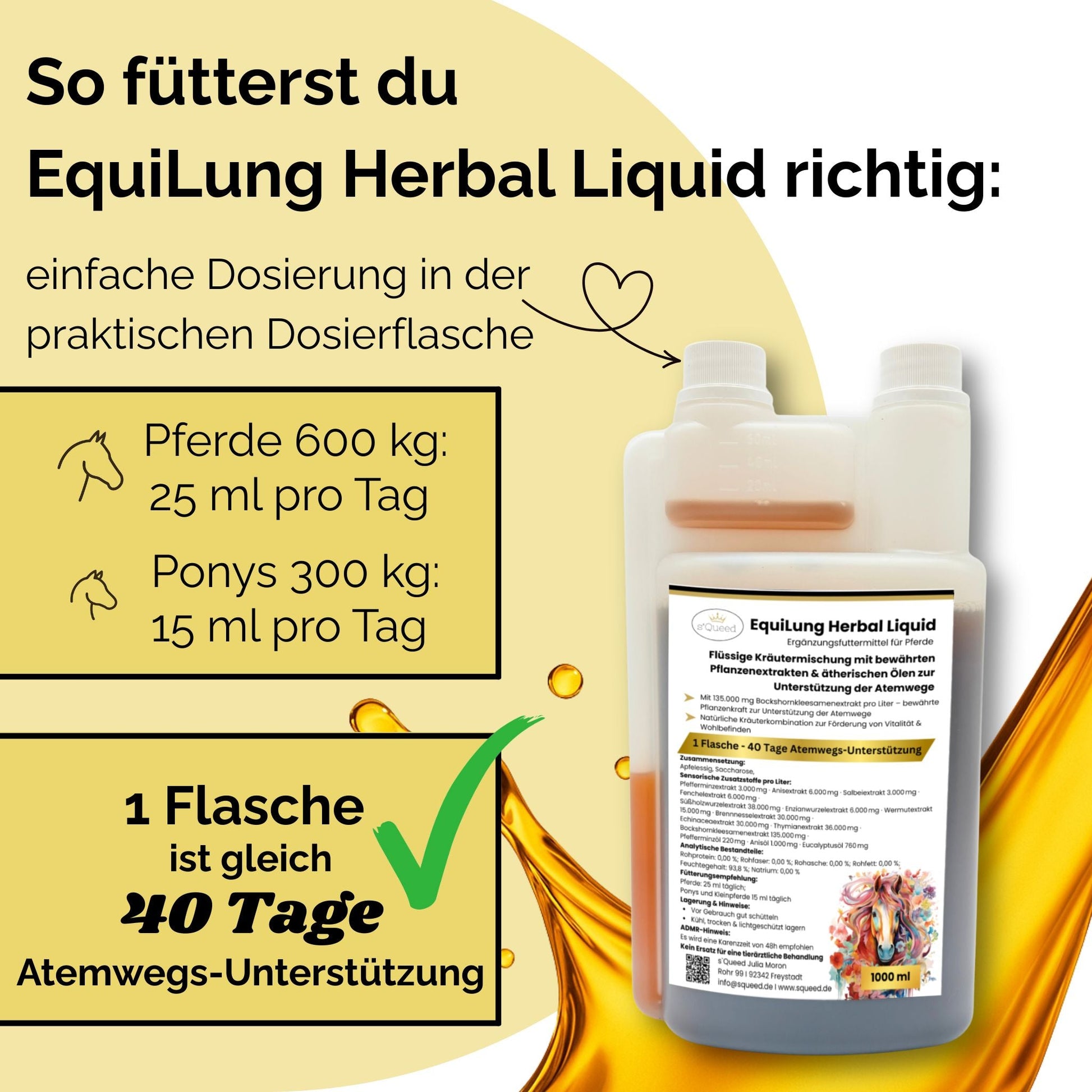 Inhalt: 1000 ml – reicht ca. 40 Tage bei Großpferden / ca. 66 Tage bei Ponys