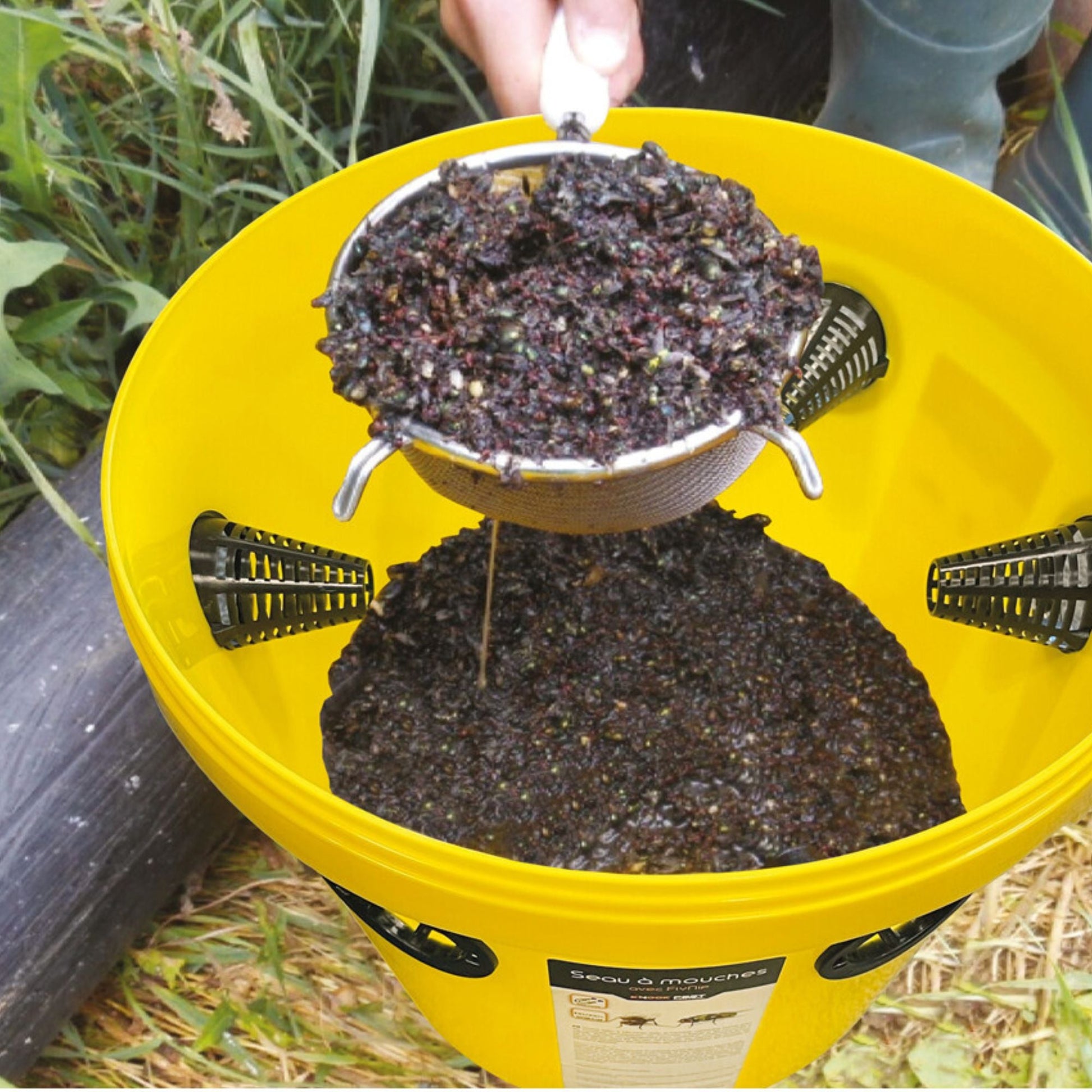 Der FlyNip Eimer lockt Fliegen mit einem natürlichen Lockstoff aus fermentierter Hefe und Zutaten aus der Lebensmittelindustrie zuverlässig an. Die Fliegen werden über speziell entwickelte Einwegöffnungen in den Eimer gelockt – und kommen nicht mehr heraus. Durch die Zersetzung der gefangenen Fliegen verstärkt sich der Lockeffekt zusätzlich. Ideal für Stallbereiche, Ausläufe, Offenställe und Weiden.