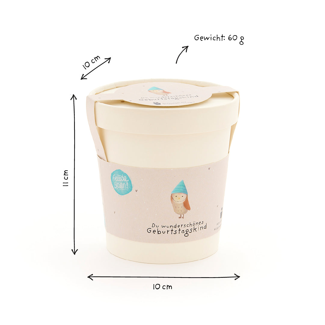 Nachhaltig: Der Becher besteht aus umweltfreundlichem Material, die Verpackung ist plastikfrei. Ein Geschenk, das nicht nur dem Geburtstagskind, sondern auch der Natur eine Freude macht.