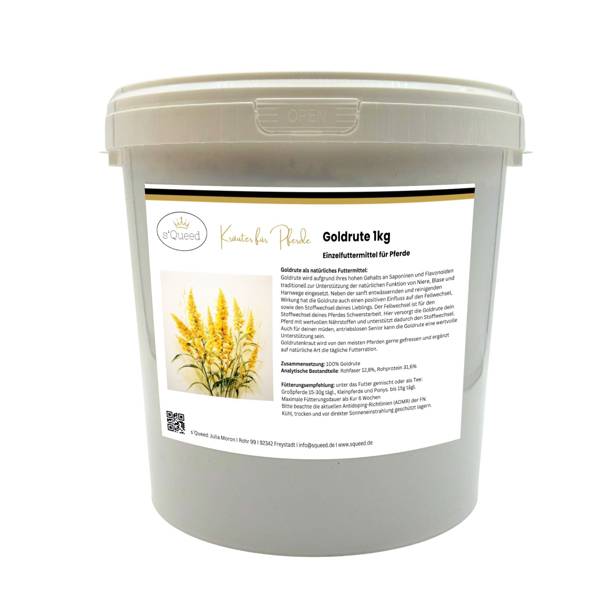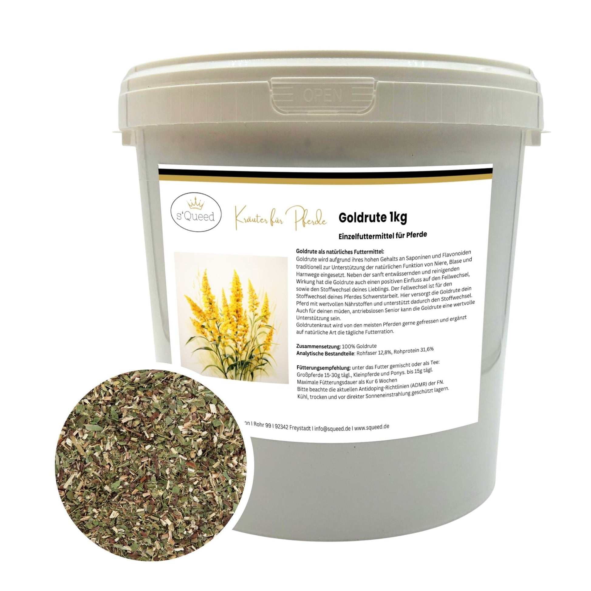 Goldrute ist ein Einzelfuttermittel für Pferde, bestehend aus 100 % geschnittenem Goldrutenkraut (Solidago virgaurea). Die enthaltenen Saponine und Flavonoide sind bekannt für ihre unterstützende Wirkung auf die Harnwege und den Stoffwechsel. Sie können dazu beitragen, Niere und Blase auf natürliche Weise zu entlasten und den Stoffwechsel deines Pferdes anzuregen.