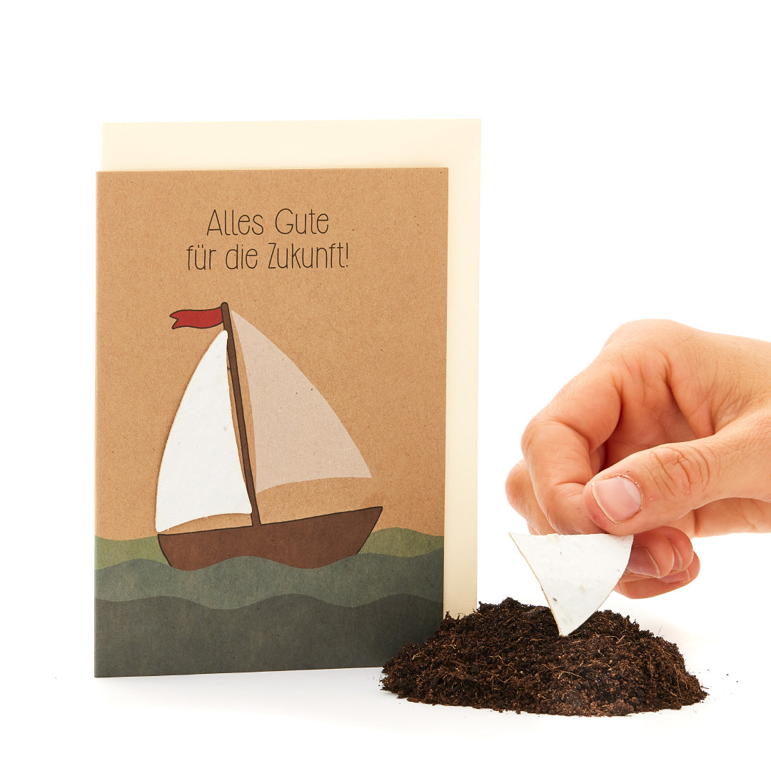 Diese werden zauberhaft überbracht mit unser liebevoll gestalteten Grußkarte. Das Segelschiff verwandelt sich später übrigens in kunterbunte Blümchen.