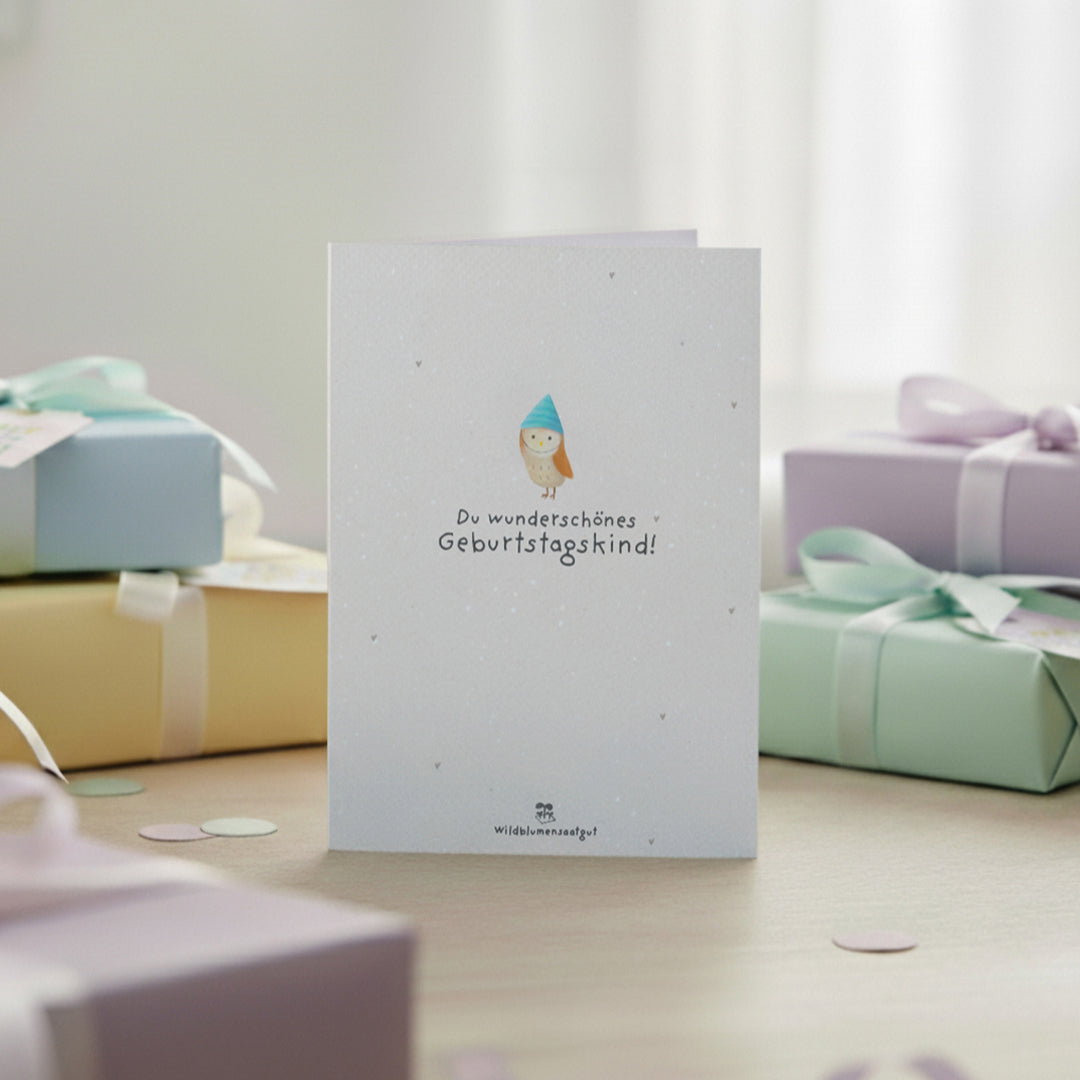 Du wunderschönes Geburtstagskind: Diese Karte ist ein liebevoller Gruß an einen Menschen, der an seinem großen Tag ganz besonders strahlen soll. Ob zum runden Geburtstag oder als Geschenk zur Geburtstagsparty - sie sagt: Du bist wichtig, du wirst gefeiert, und es ist schön, dass es dich gibt.