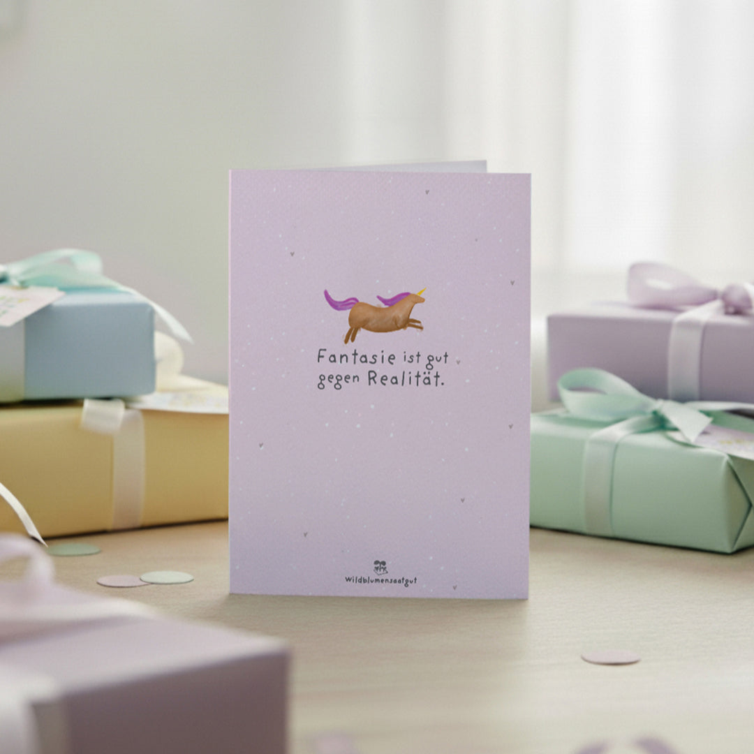 🦄 Fantasie ist gut gegen Realität: Diese Karte erinnert mit einem Augenzwinkern daran, dass Träume manchmal genau das sind, was wir brauchen. Sie schenkt ein bisschen Leichtigkeit, ein bisschen Farbe – und die Erlaubnis, einfach mal abzutauchen.