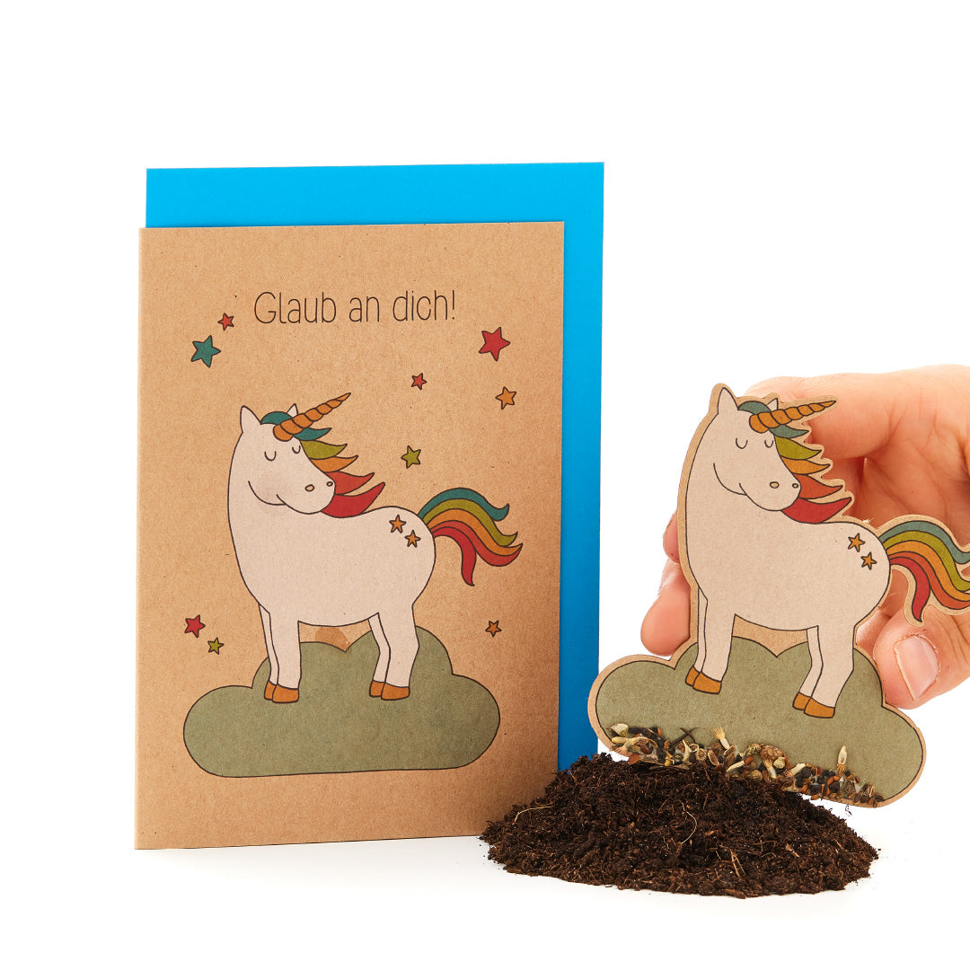 • Die angeheftete Form ist aus dicker Pappe hergestellt und unten mit einer großen Menge Saatgut bestückt. Die Form einfach ablösen, in die Erde stecken und gießen - sie löst sich nicht auf, sondern verwächst sich langsam im bunten Grün.
