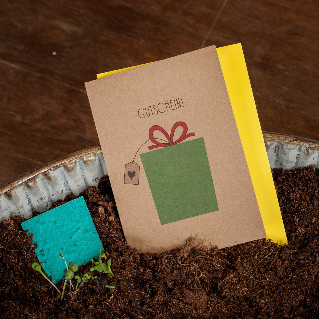 Und einen Blumenstrauß schenkst du gleich mit: Denn das Geschenk auf dem Vorderen der Karte verwandelt sich nach dem Einpflanzen in einen kunterbunten Blumenstrauß.