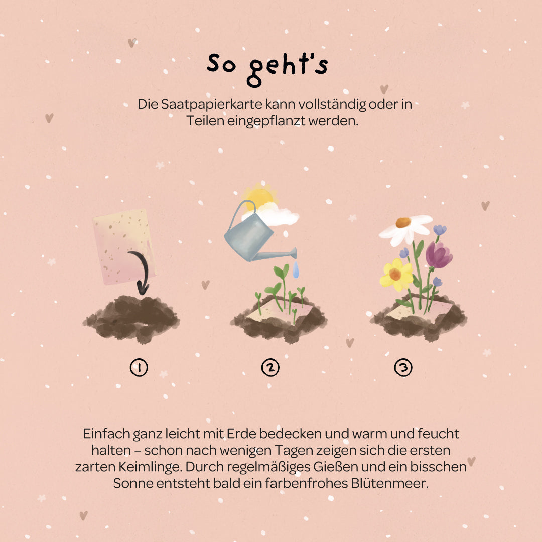 Einfach einpflanzen: Die Karte kann im Ganzen oder in Stücke gerissen eingepflanzt werden. Mit etwas Erde und Wasser entsteht ein buntes Blütenmeer - eine schöne Erinnerung an das, was euch verbindet.