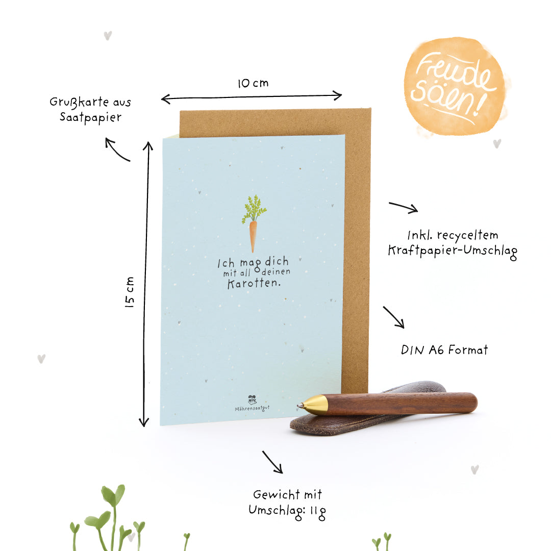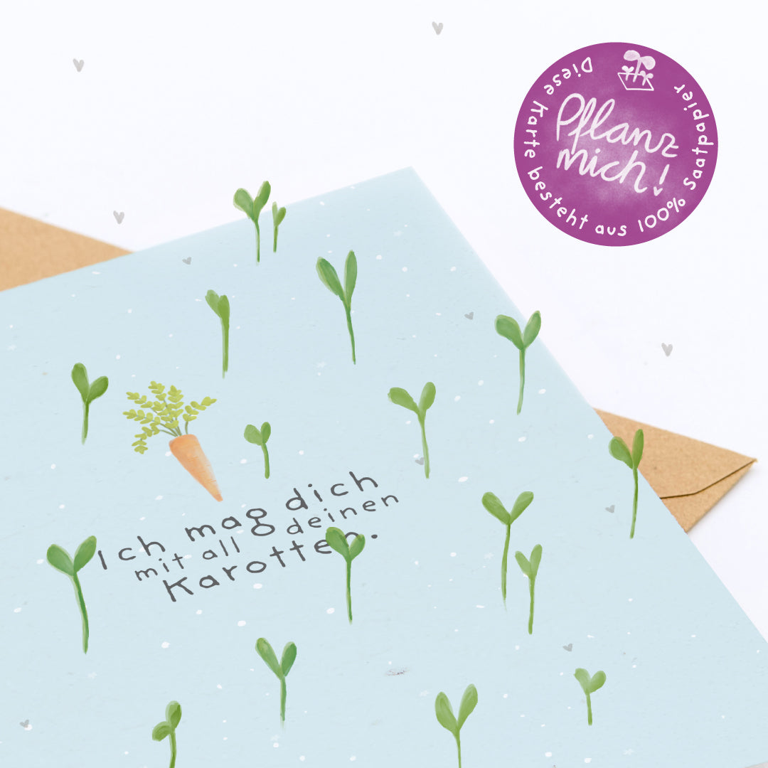 Ein Gefühl, das Wurzeln schlägt: Aus dem Saatpapier wachsen bald echte Möhren - tief verwurzelt und herrlich unperfekt. Genau wie die besten Verbindungen im Leben: ehrlich, charmant schief und einfach zum Liebhaben.