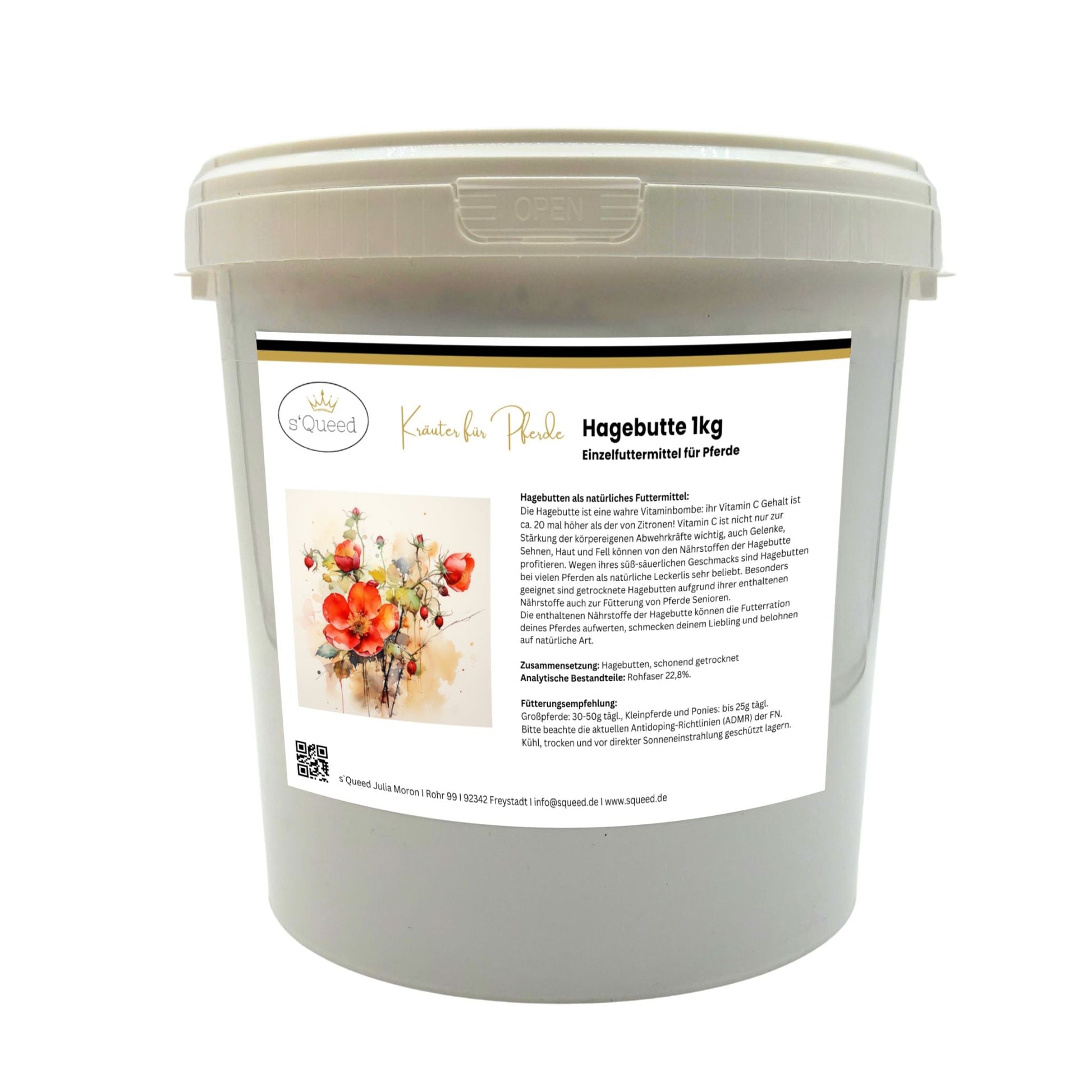 Die Hagebutte beeindruckt mit einem Vitamin-C-Gehalt, der 20-mal höher ist als der von Zitronen! Diese wertvollen Nährstoffe unterstützen nicht nur das Immunsystem sondern fördern auch gesunde Gelenke, Sehnen, Haut und Fell. Ihr süß-säuerlicher Geschmack macht sie zur idealen Wahl als Snack, Mash-Topping oder tägliche Belohnung. Besonders für Seniorenpferde bieten Hagebutten eine sanfte, natürliche Unterstützung.