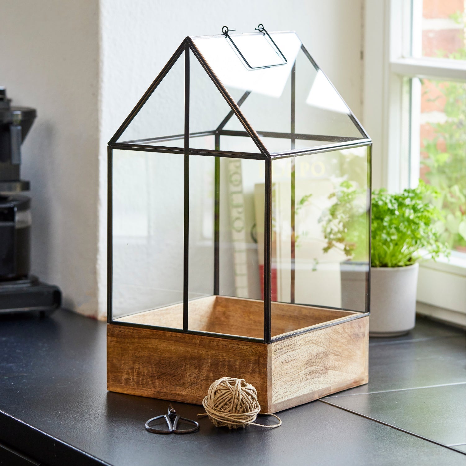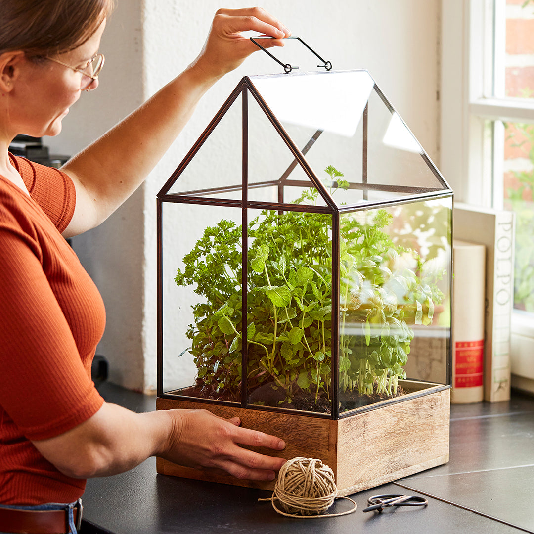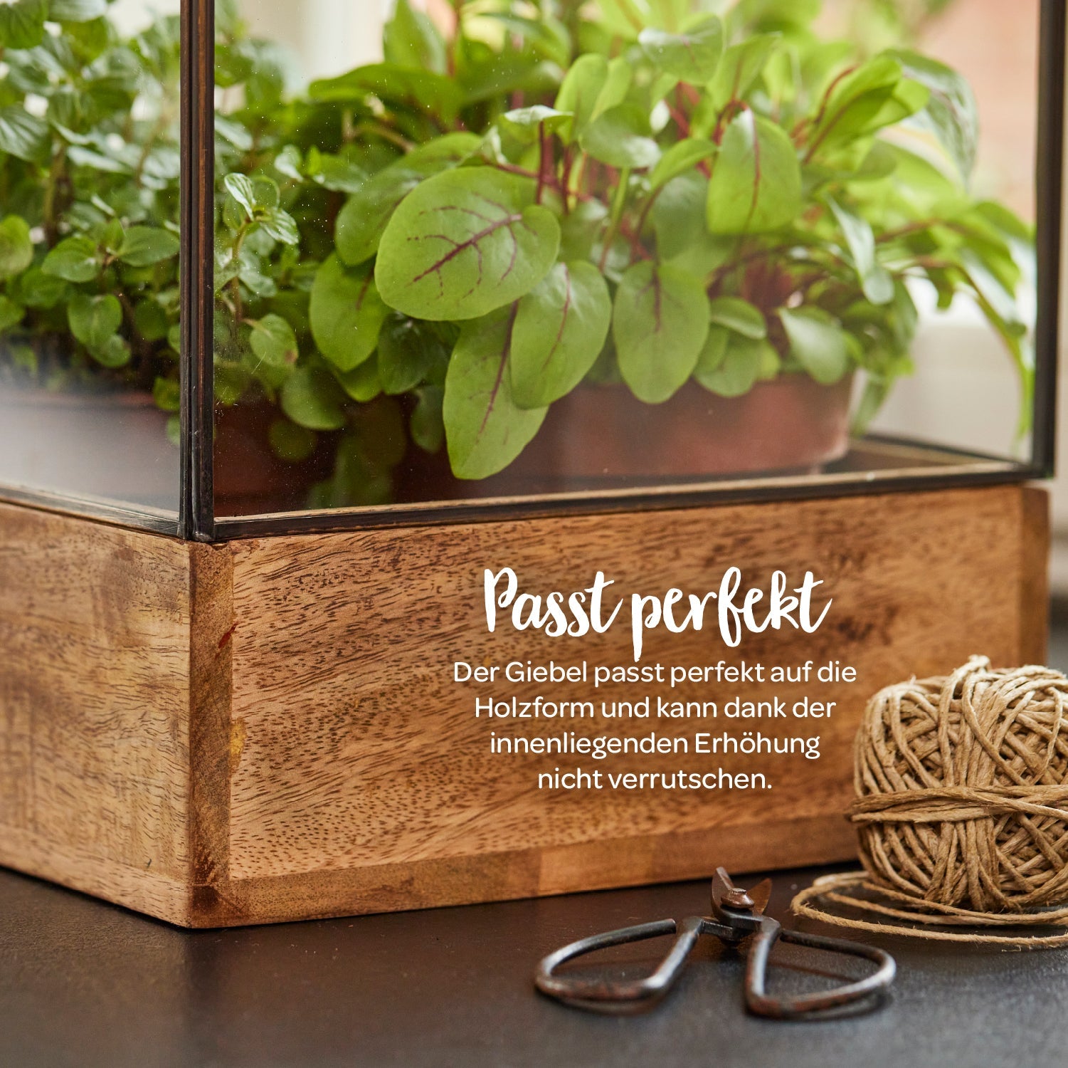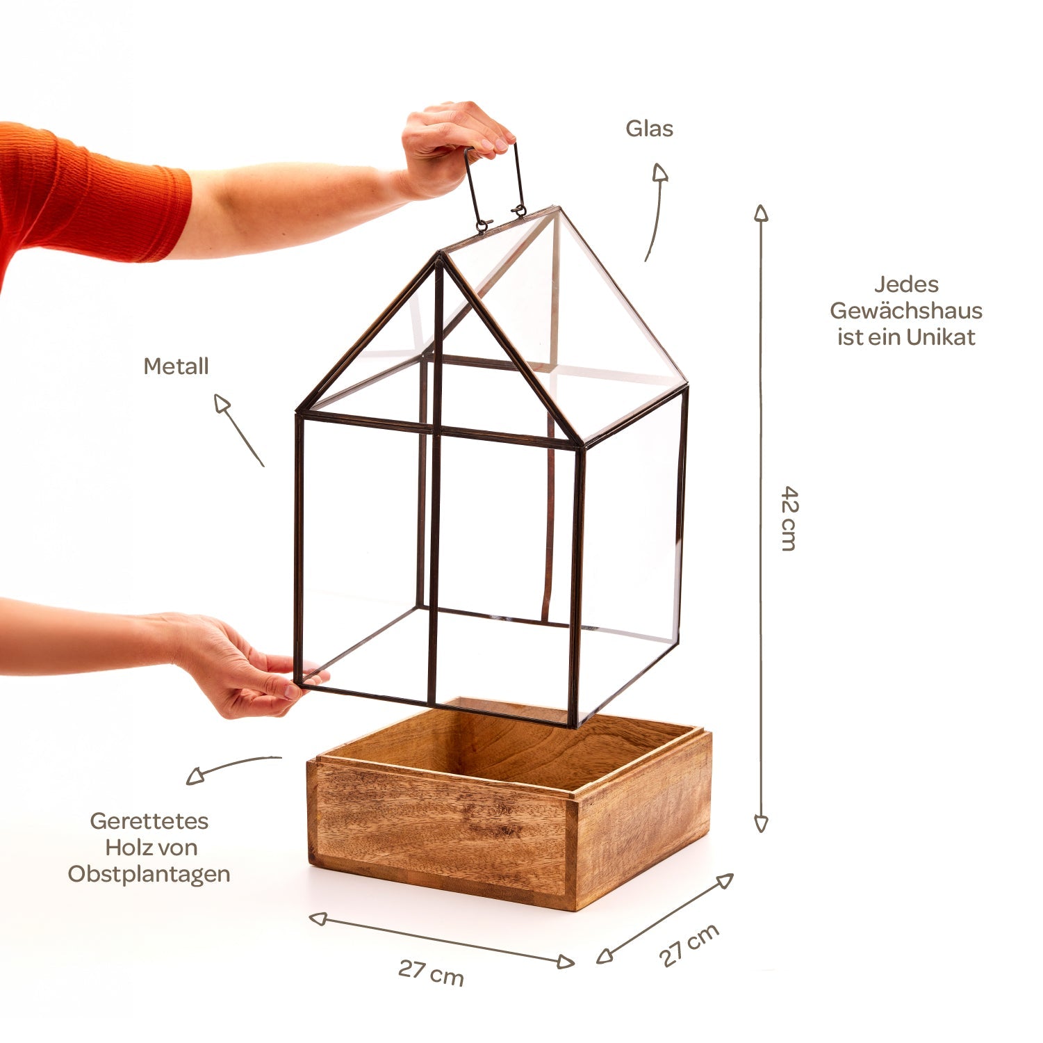 Details: Das Gewächshaus hat eine Grundfläche von 27 cm x 27 cm und ist 48 cm hoch. Ideal z.B. für 4 Kräuterpflanzen aus dem Supermarkt. Das Haus besteht aus recyceltem Holz, Glas und Metall. Es ist ideal zur Anzucht von Gemüse oder als Kräutergarten geeignet. Außerdem ist unser Gewächshaus ein wunderschöner Hingucker und Dekoartikel!