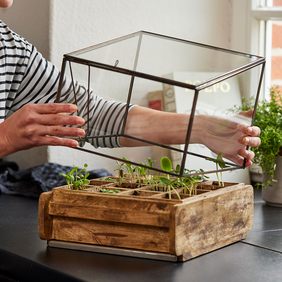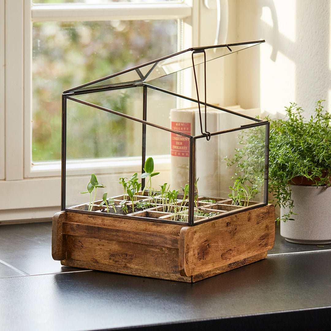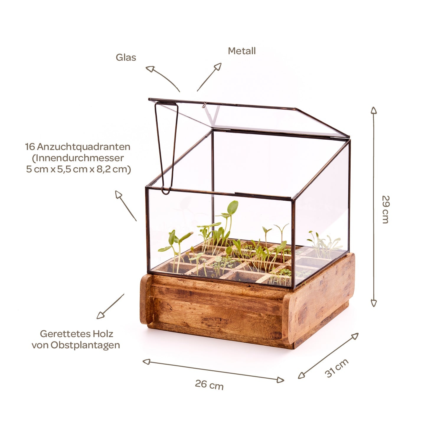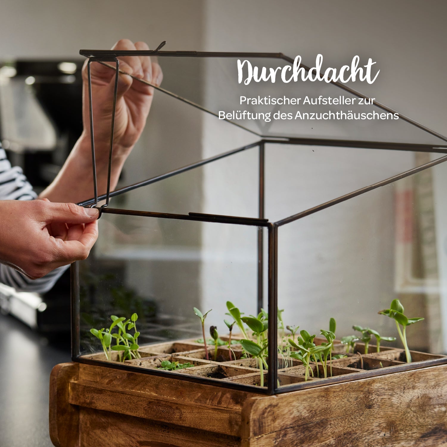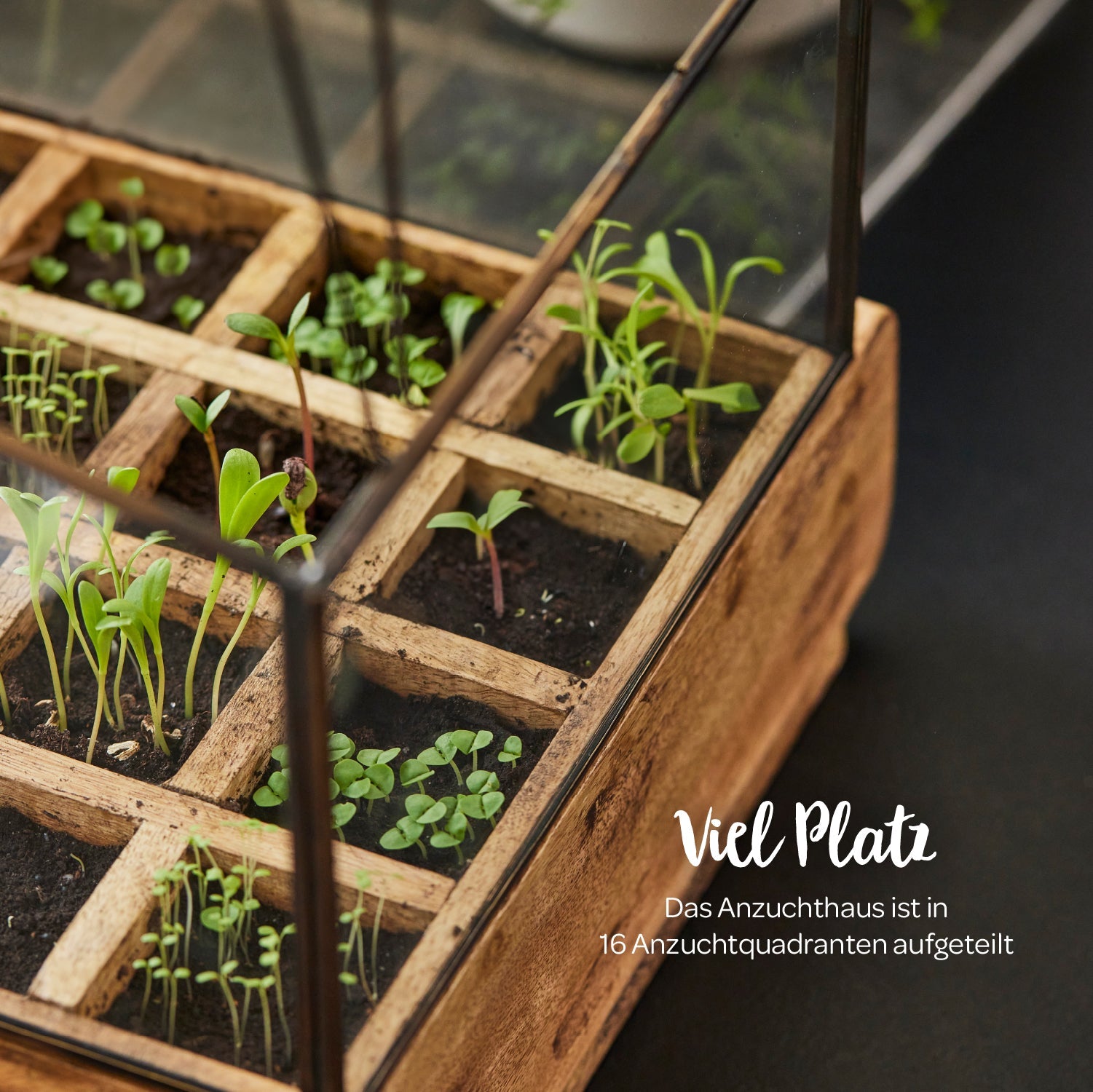 Details: Das Anzuchthaus hat eine Grundfläche von 31 cm x 26 cm und ist 29 cm hoch. Es ist eingeteilt in 16 Anzuchtquadranten (Innendurchmesser 5 cm x 5,5 cm und 8,2 cm hoch) und hat einen herausschiebbaren Boden, wodurch die vorgezogenen Pflanzen leicht und schonend herauszubekommen sind. Das Anzuchthaus ist aber nicht nur praktisch, sondern auch ein wunderschöner Hingucker in deinem Zuhause.