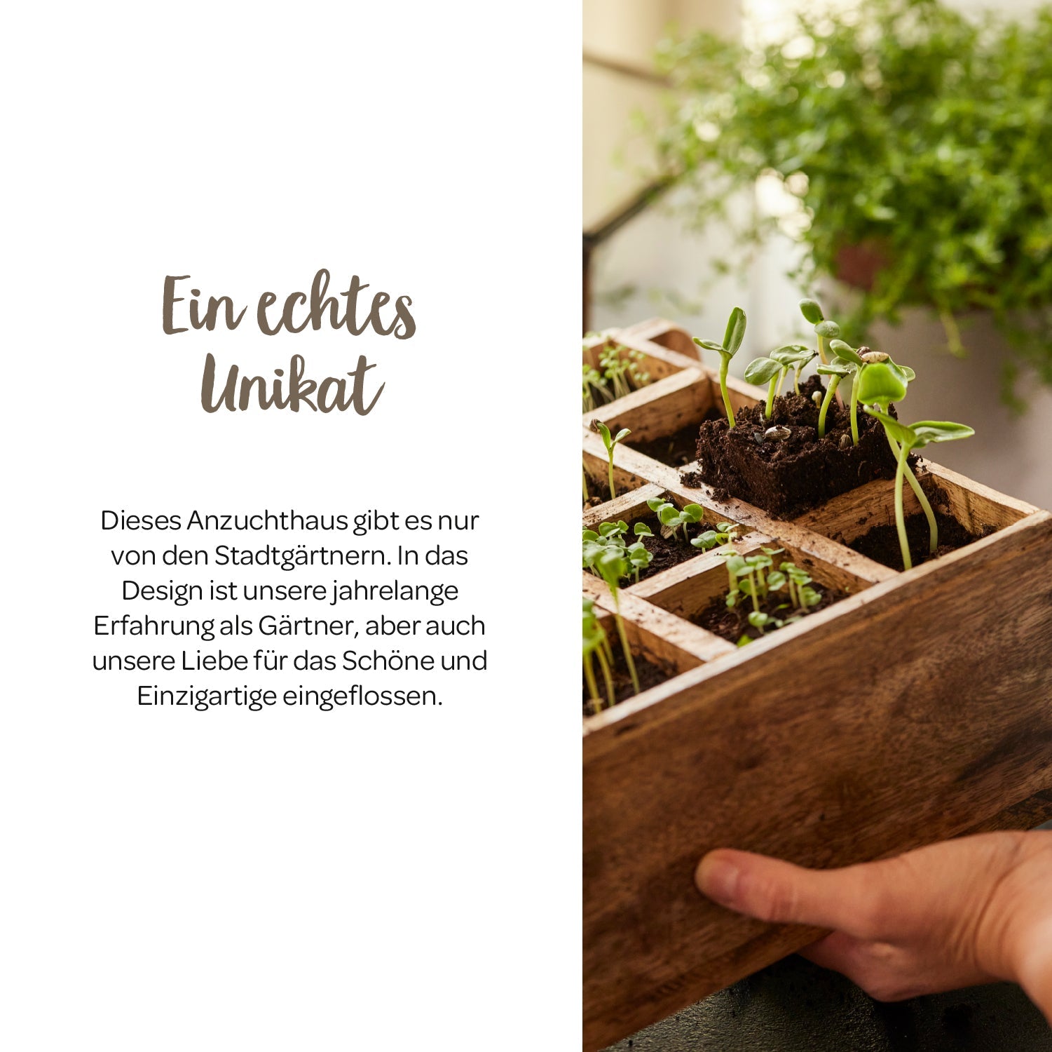 Absolut einzigartig: Dieses Anzuchthaus gibt es nur von den Stadtgärtnern. In das Design ist unsere jahrelange Erfahrung als Gärtner, aber auch unsere Liebe für das Schöne und Einzigartige eingeflossen. Jede Gewächshaus ist handgefertigt und hat daher ihren individuellen Look. Am Boden ist unser Stadtgärtner-Logo eingelasert.