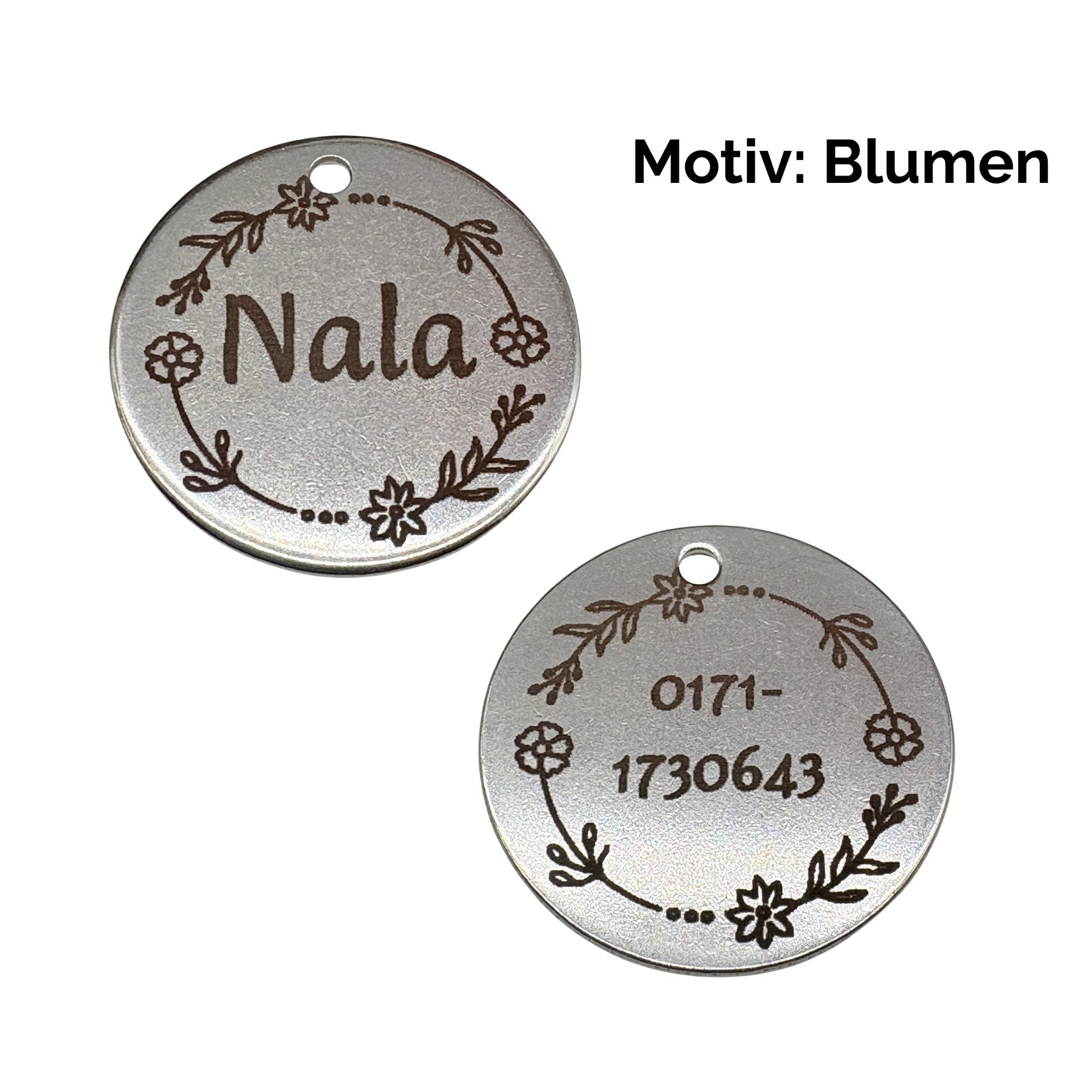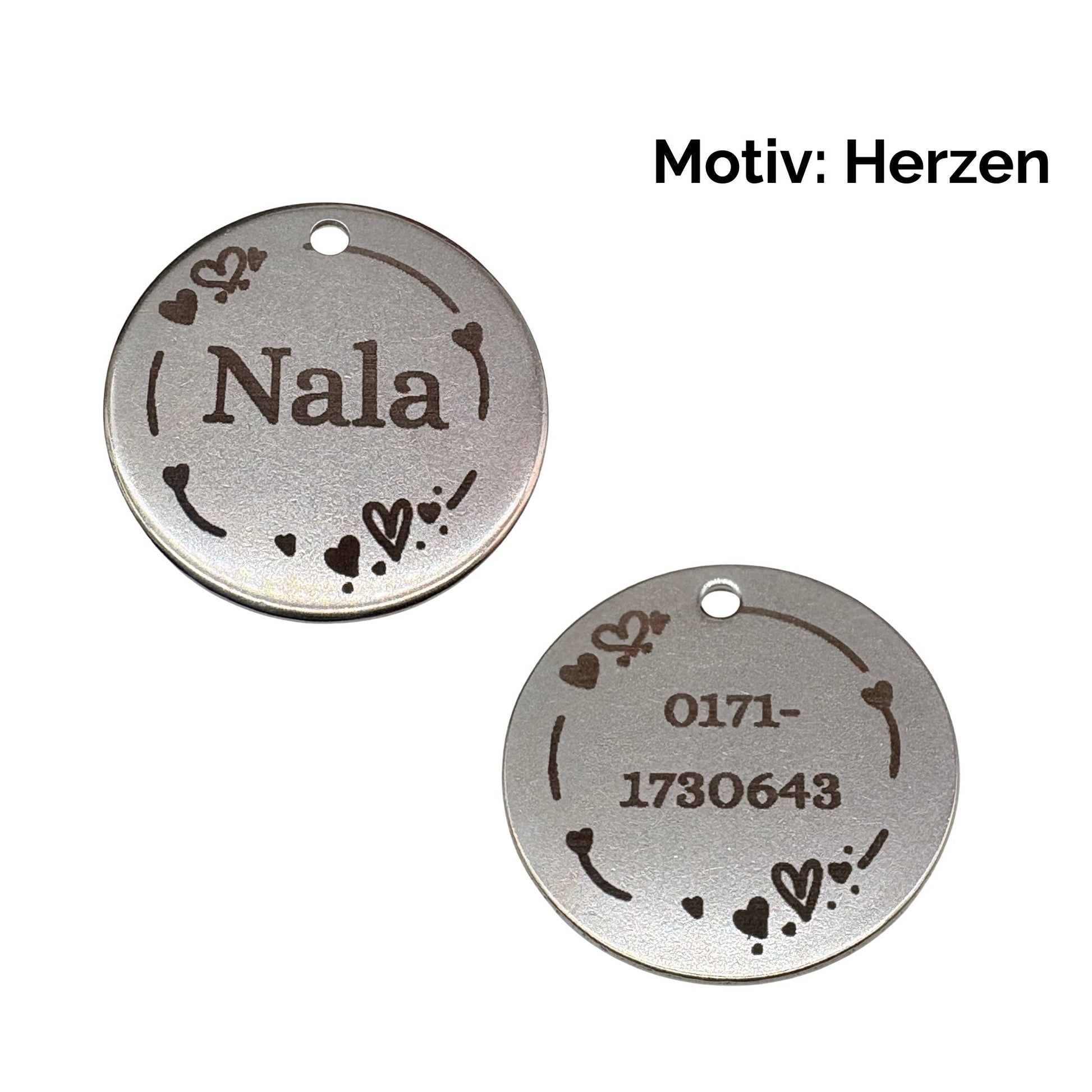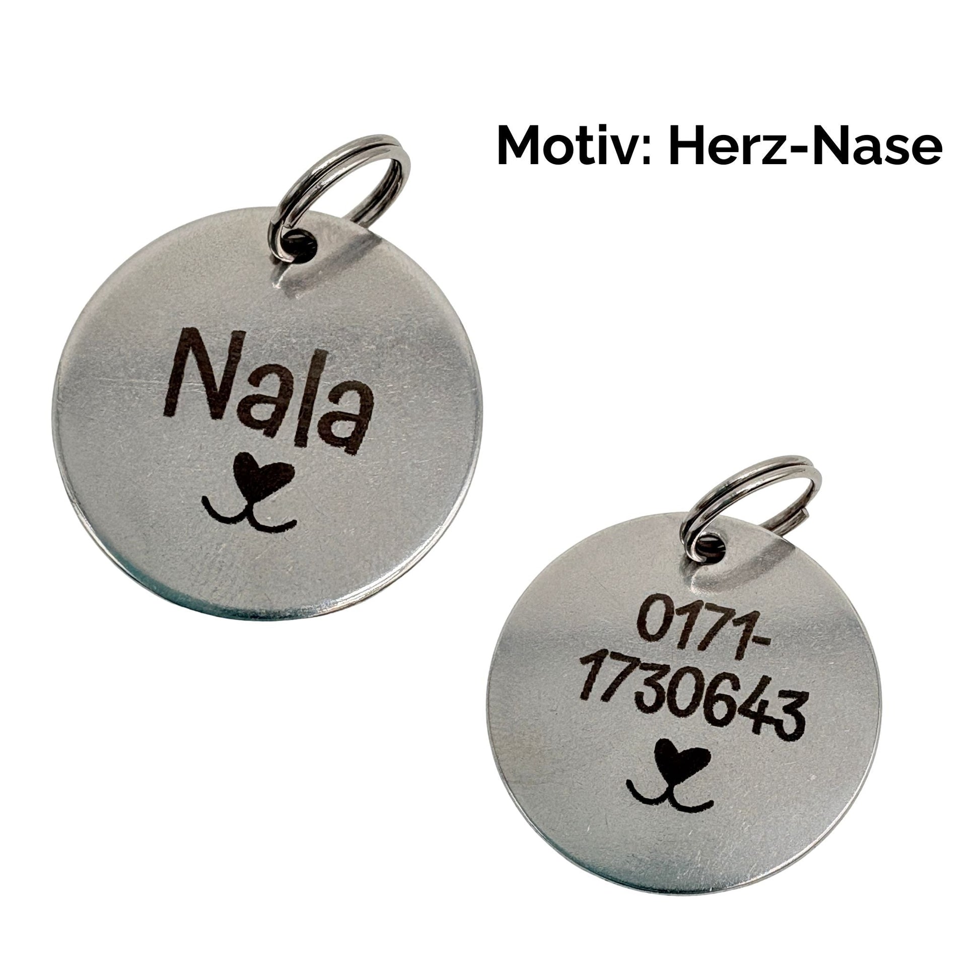 Diese schlichte und hochwertige Marke aus Edelstahl (Ø 25 mm) wird beidseitig nach deinen Vorgaben graviert. Du wählst ein passendes Motiv, ergänzt den Namen deines Hundes sowie deine Telefonnummer. So entsteht ein kleines, persönliches Detail mit großer Bedeutung im Ernstfall.