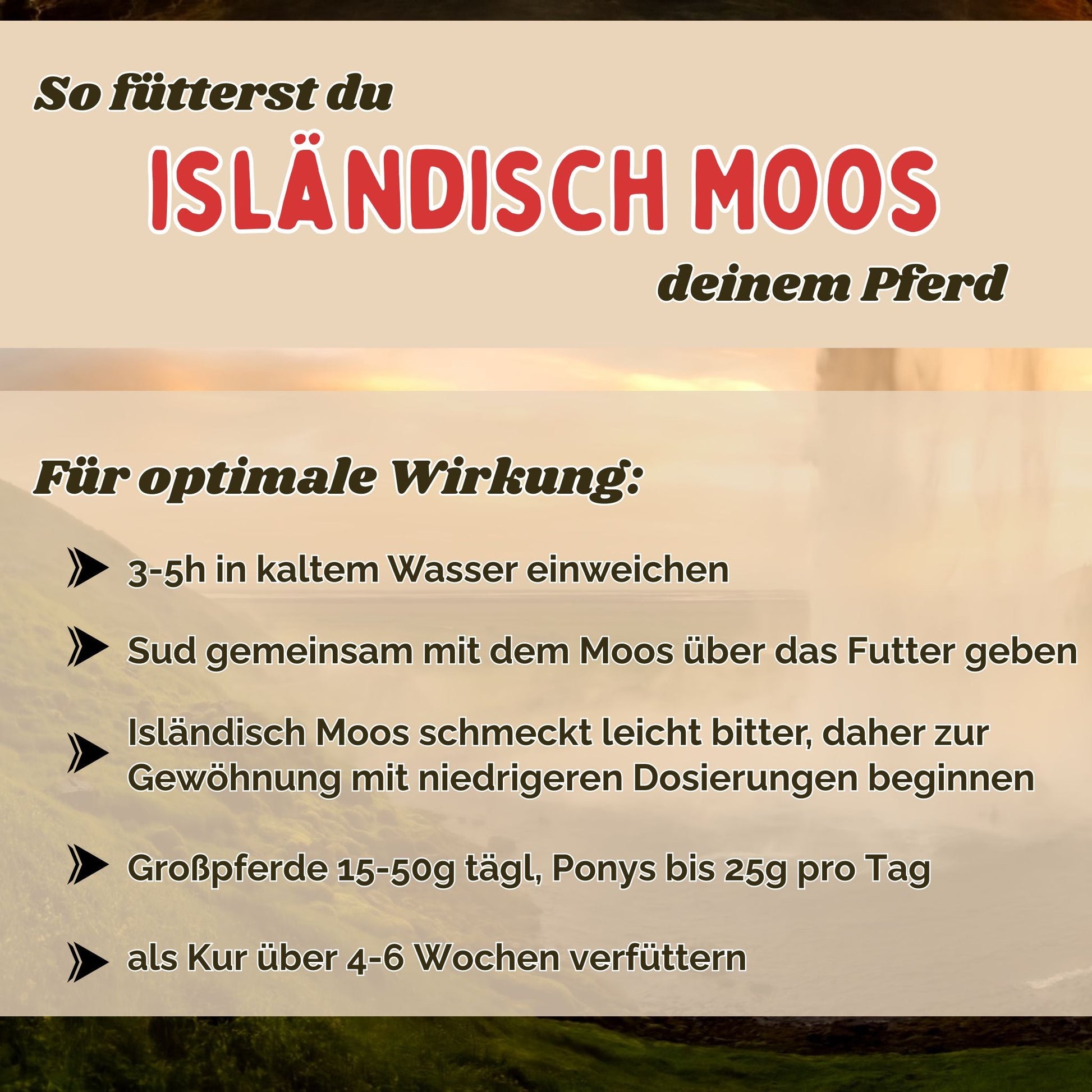 Ponys & Kleinpferde: bis 25 g täglichAls Kaltauszug: Isländisch Moos 3–5 Stunden in kaltem Wasser einweichen, dann zusammen mit dem Sud über das Futter oder ins Mash geben. Isländisch Moos schmeckt leicht bitter, daher zur Gewöhnung mit niedrigeren Dosierungen beginnen und die Dosis langsam steigern.
