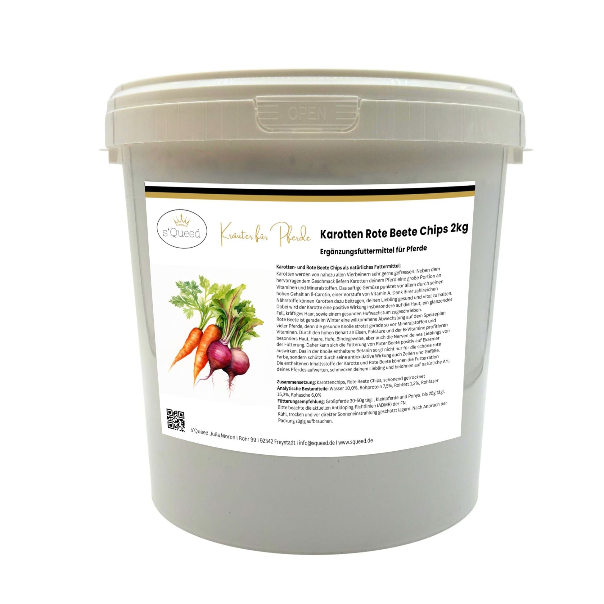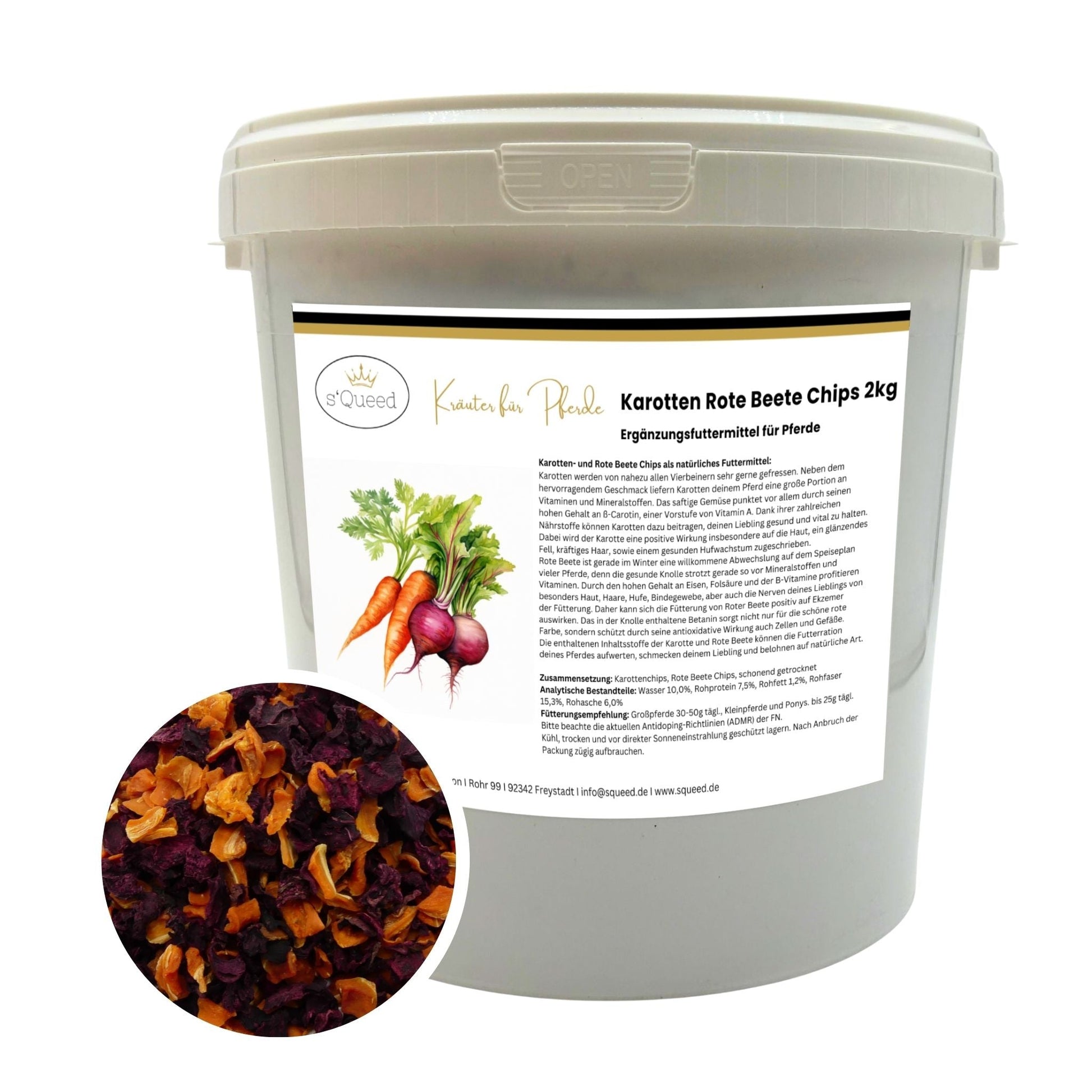 Unsere Chips werden aus sorgfältig ausgewählten Karotten und Roter Beete hergestellt, die schonend getrocknet werden, um ihre natürlichen Vitamine und Mineralstoffe zu bewahren. Karottenchips liefern ß-Carotin, das glänzendes Fell, gesundes Hufwachstum und kräftige Haare fördern kann. Rote Beete Chips stecken voller Eisen, Folsäure und B-Vitamine, die besonders Haut, Hufe und Nerven stärken.