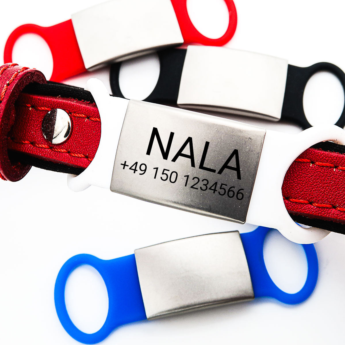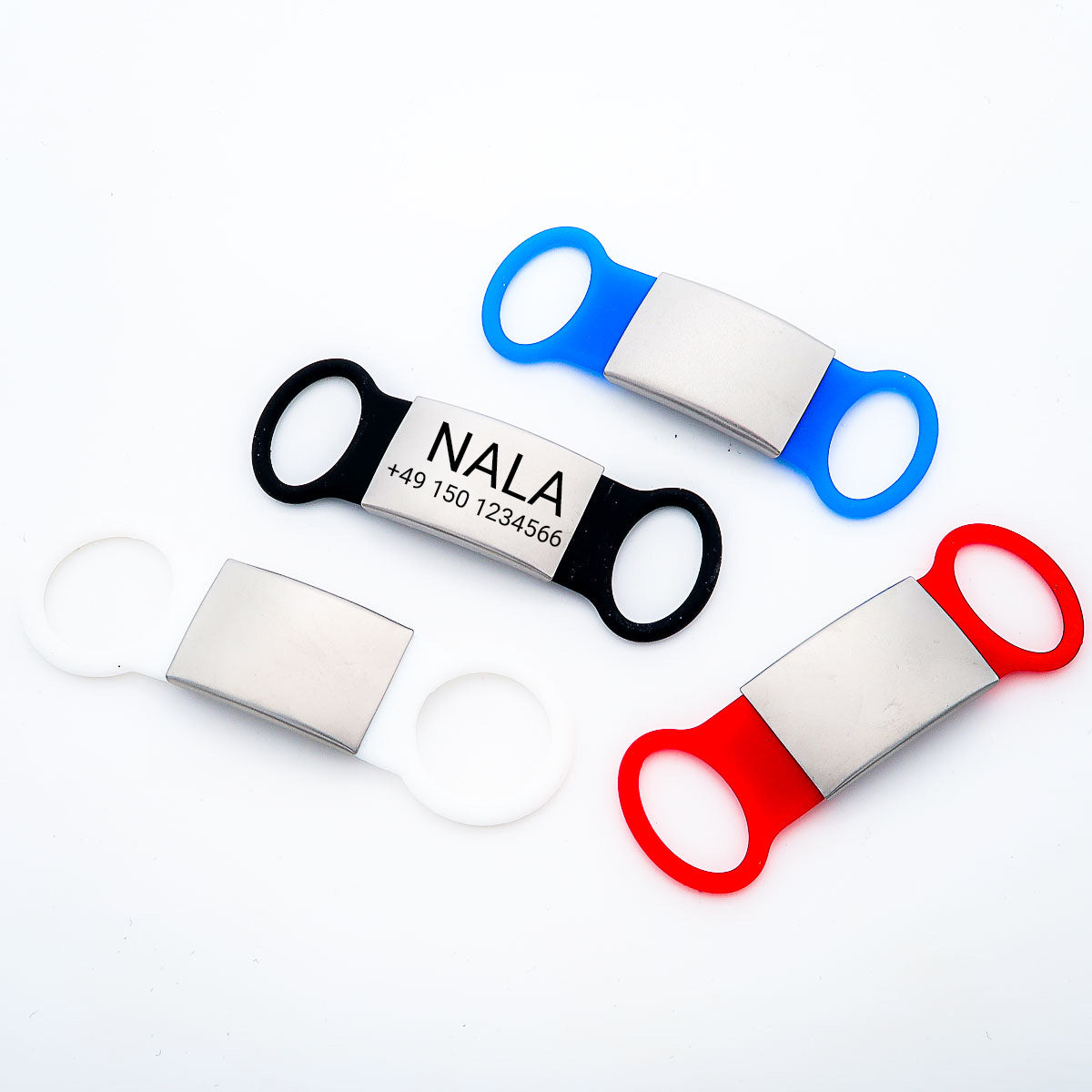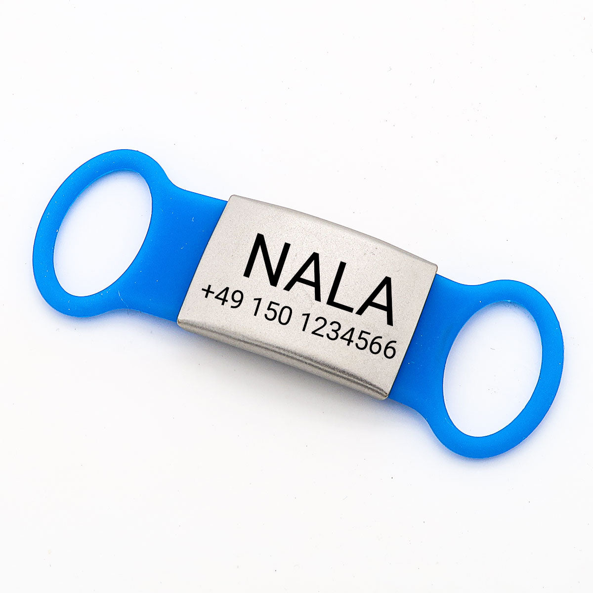Der abnehmbare Slider aus weichem und haltbaren Silikon trägt eine hochwertige und rostfreie Edelstahlmarke, die wir mit Ihren individuellen Gravurinformationen Name und Telefonnummer per Lasergravur beschriften. Wir gravieren die Marken aufgrund der sehr guten Lesbarkeit in der Schriftart Roboto. Wir empfehlen für den Namen Großbuchstaben zu verwenden.