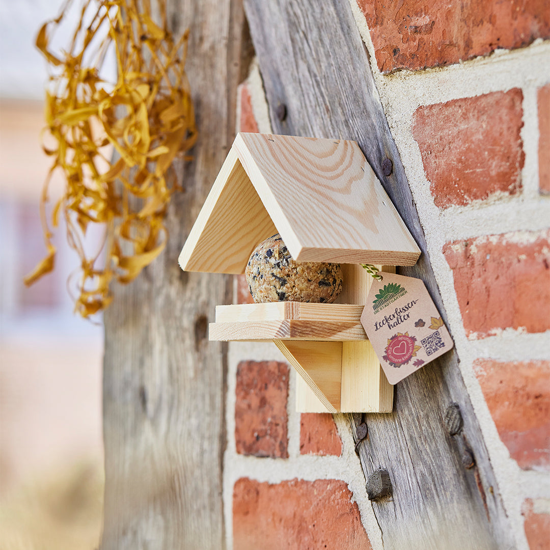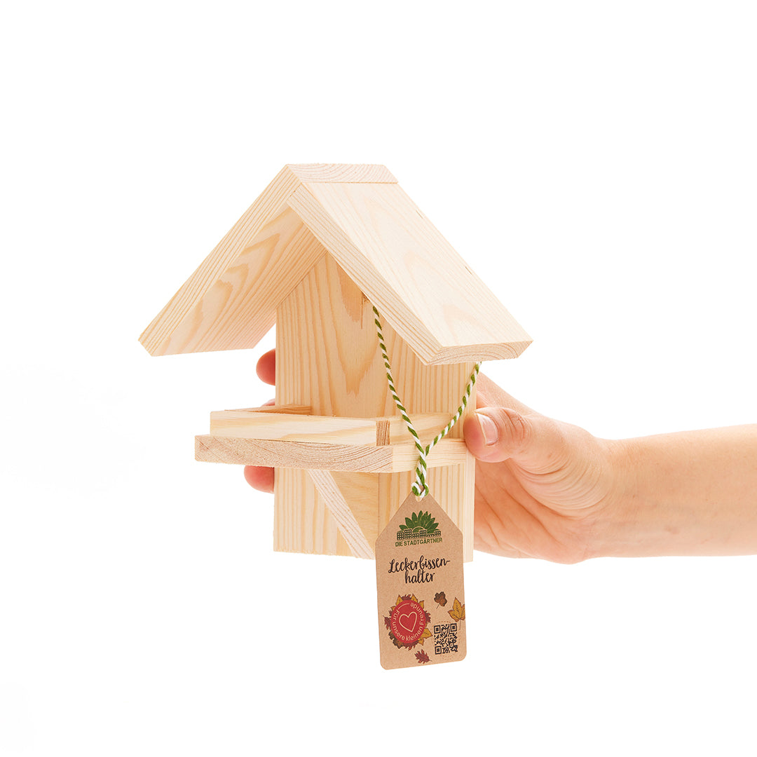 Der Leckerbissenhalter ist ein Stück Natur: Er besteht aus 100% unbehandeltem Holz aus europäischen Wäldern. Um lange Freude an ihm zu haben, hänge ihn am besten an einem geschützten Ort auf. Durch das Loch auf der Rückseite lässt er sich überall ganz einfach befestigen.