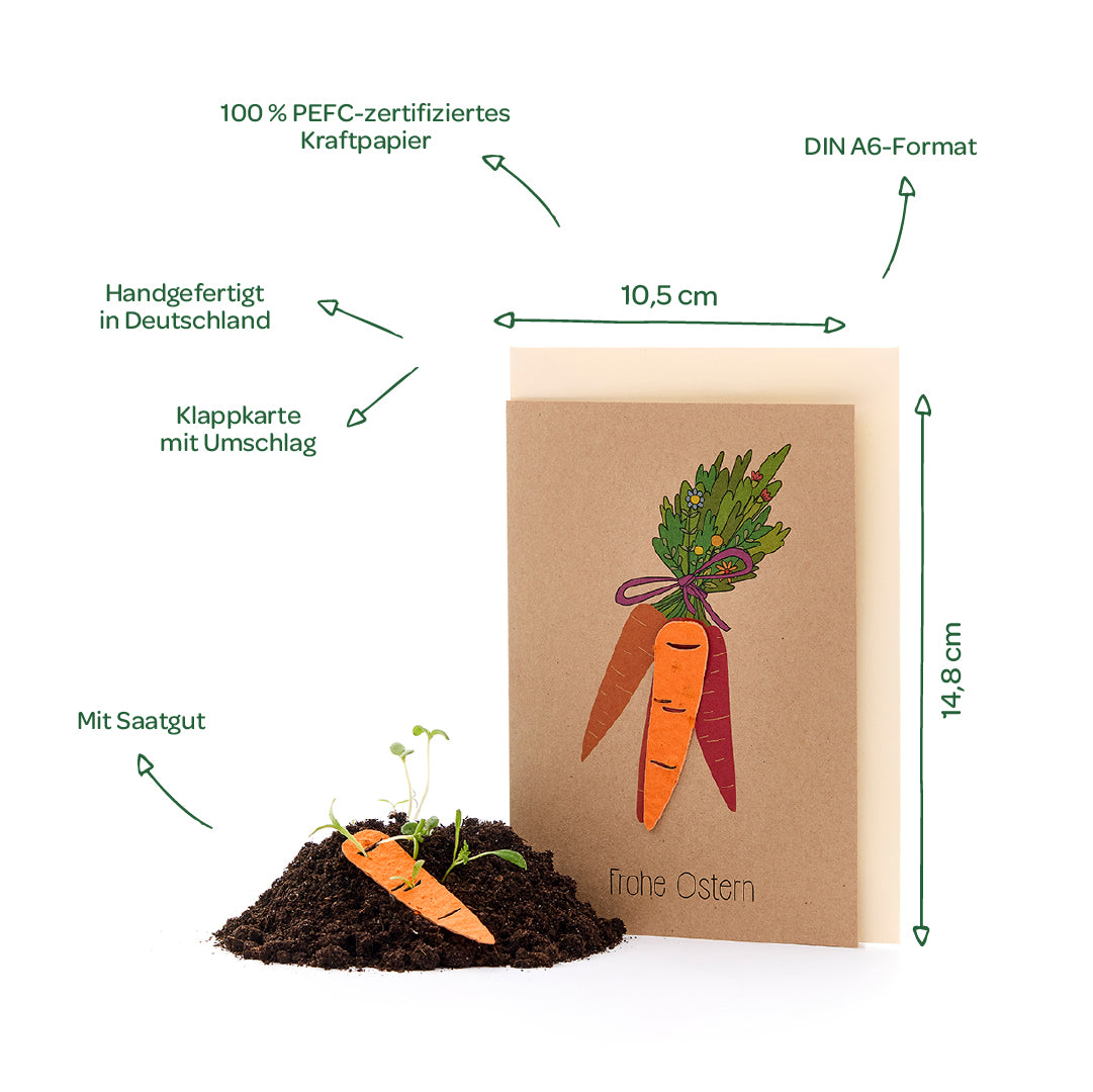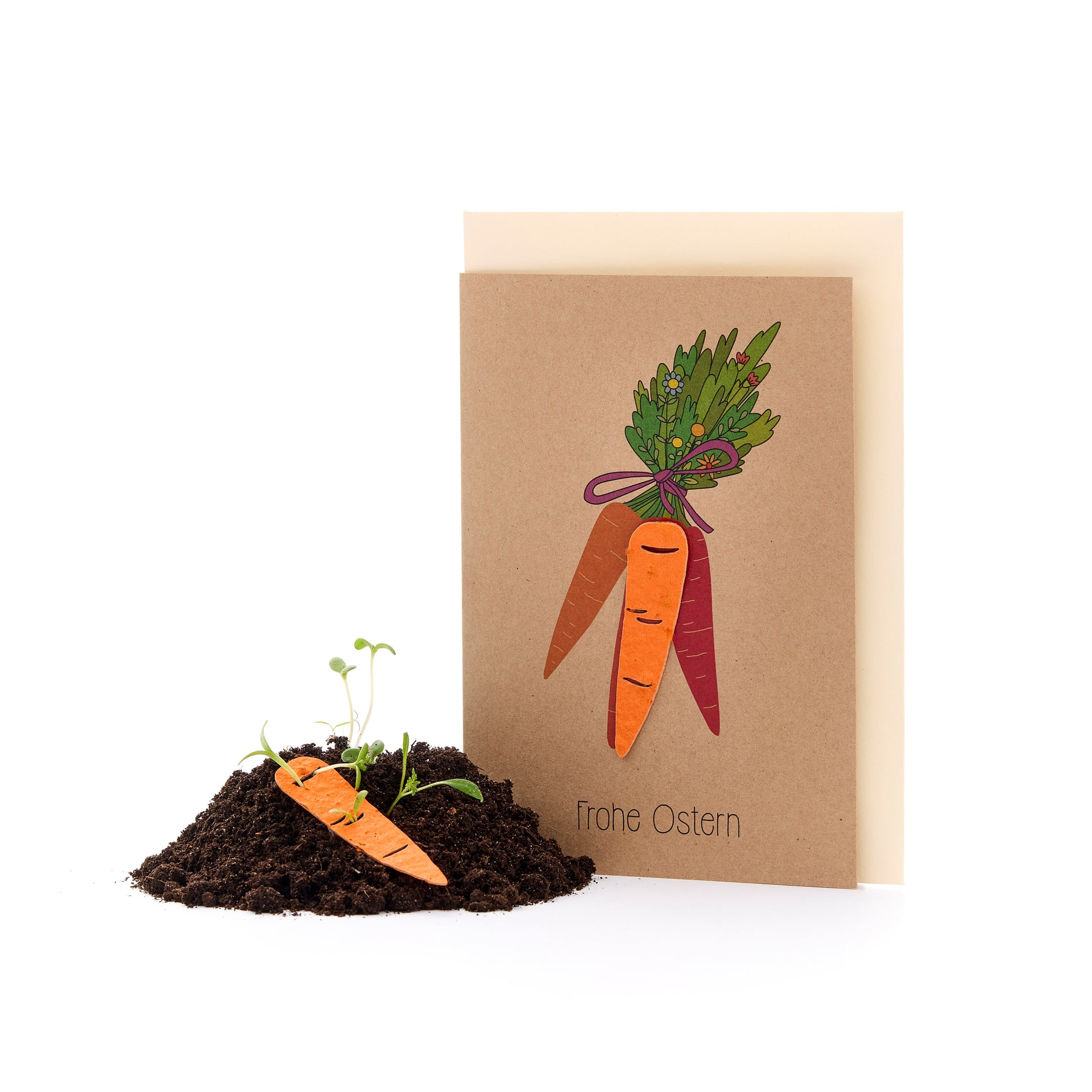 WACHSENDE OSTERGRÜßE: Verschenke eine ganz besondere Osterkarte. Das liebevoll gestaltete Möhren-Motiv besteht aus handgeschöpftem Saatpapier mit Samen für eine bunte Wildblumenwiese. Nach dem Einpflanzen wachsen aus der Grußkarte wunderschöne Blumen.