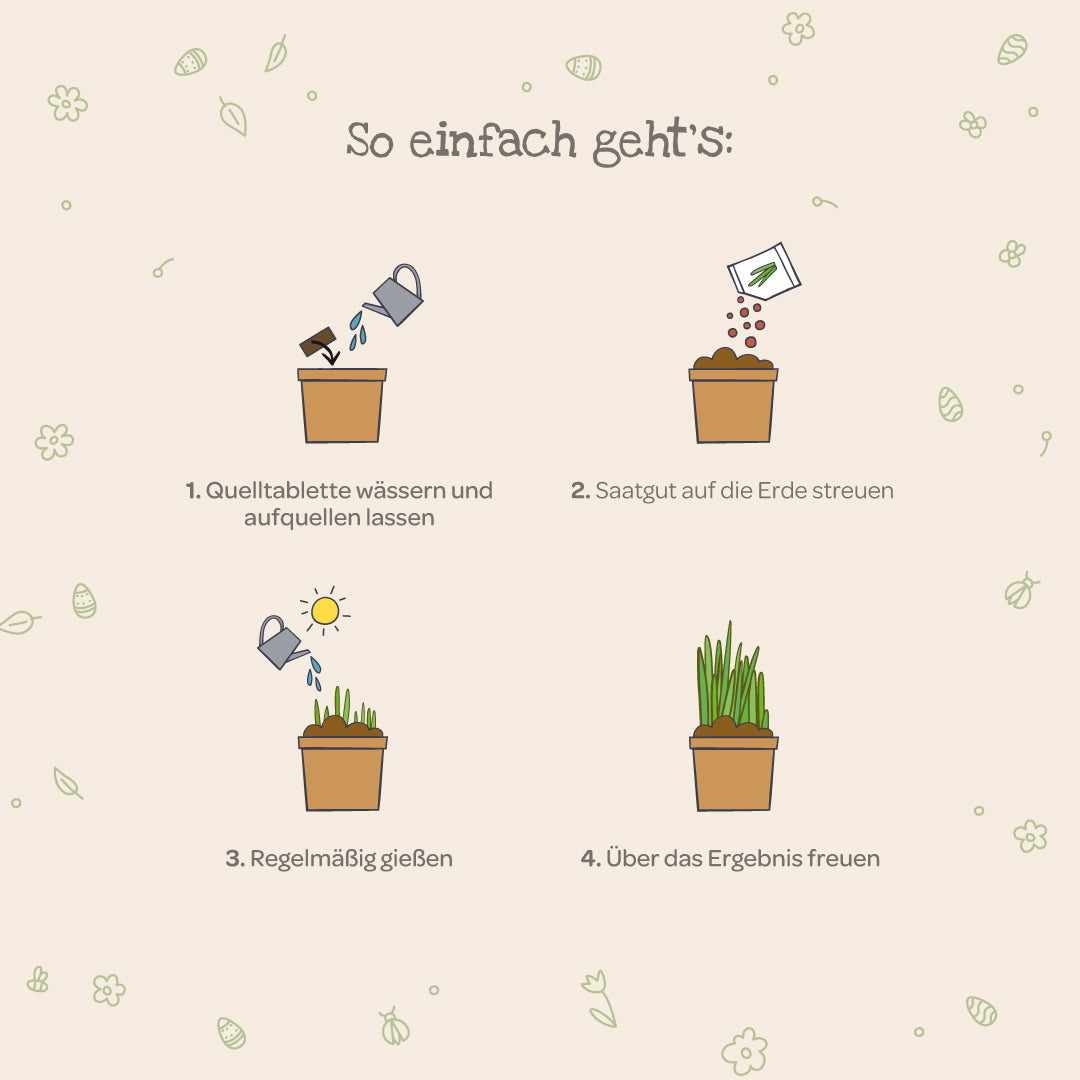 Ostergras leicht gemacht: Einfach Quelltablette aufquellen lassen, Saatgut aussäen und gießen – schon nach wenigen Tagen sprießt das Ostergras und wird zum natürlichen Hingucker in jedem Osternest!