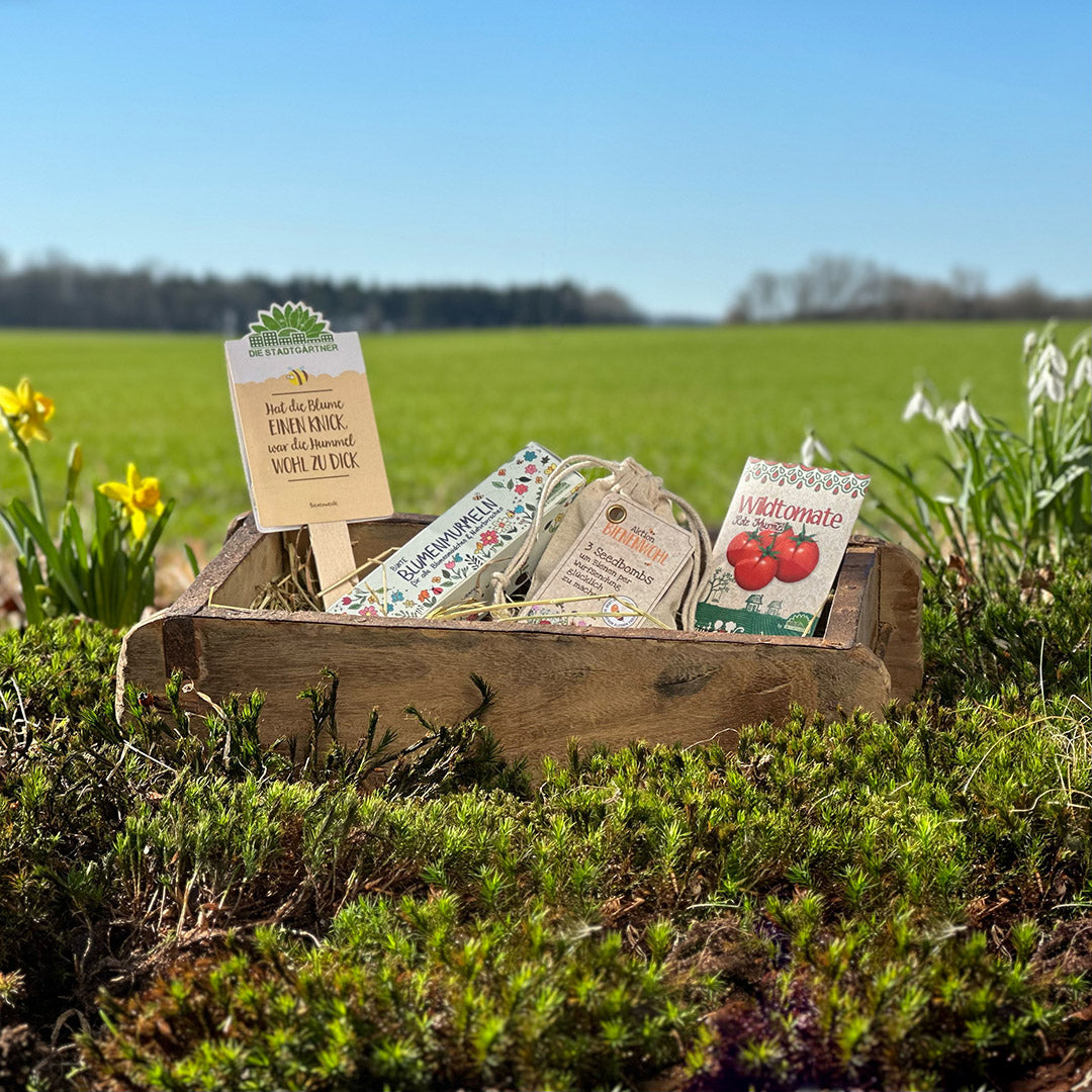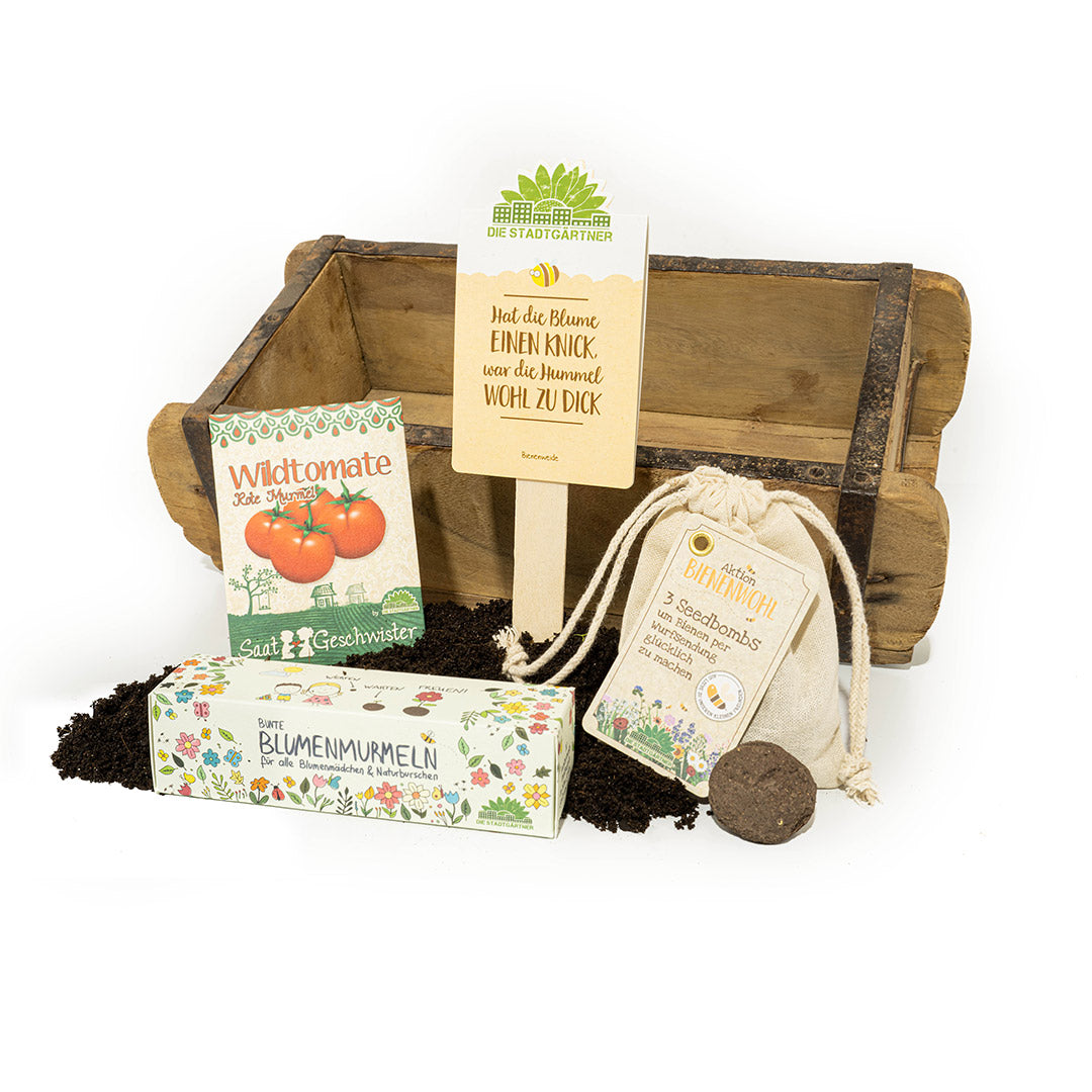 Was hat der Osterhase denn da versteckt? Dieses bunte Set inklusive Ziegelform eignet sich perfekt als Osternest für Kinder. Bunte Blumenmurmeln, ein verspielter Saatgruß, drei bienenfreundliche Seedbombs und Saatgut für leckere, kugelrunde Tomaten sorgen für strahlende Kinderaugen! An diesem Osternest werdet ihr noch lange Freude haben!