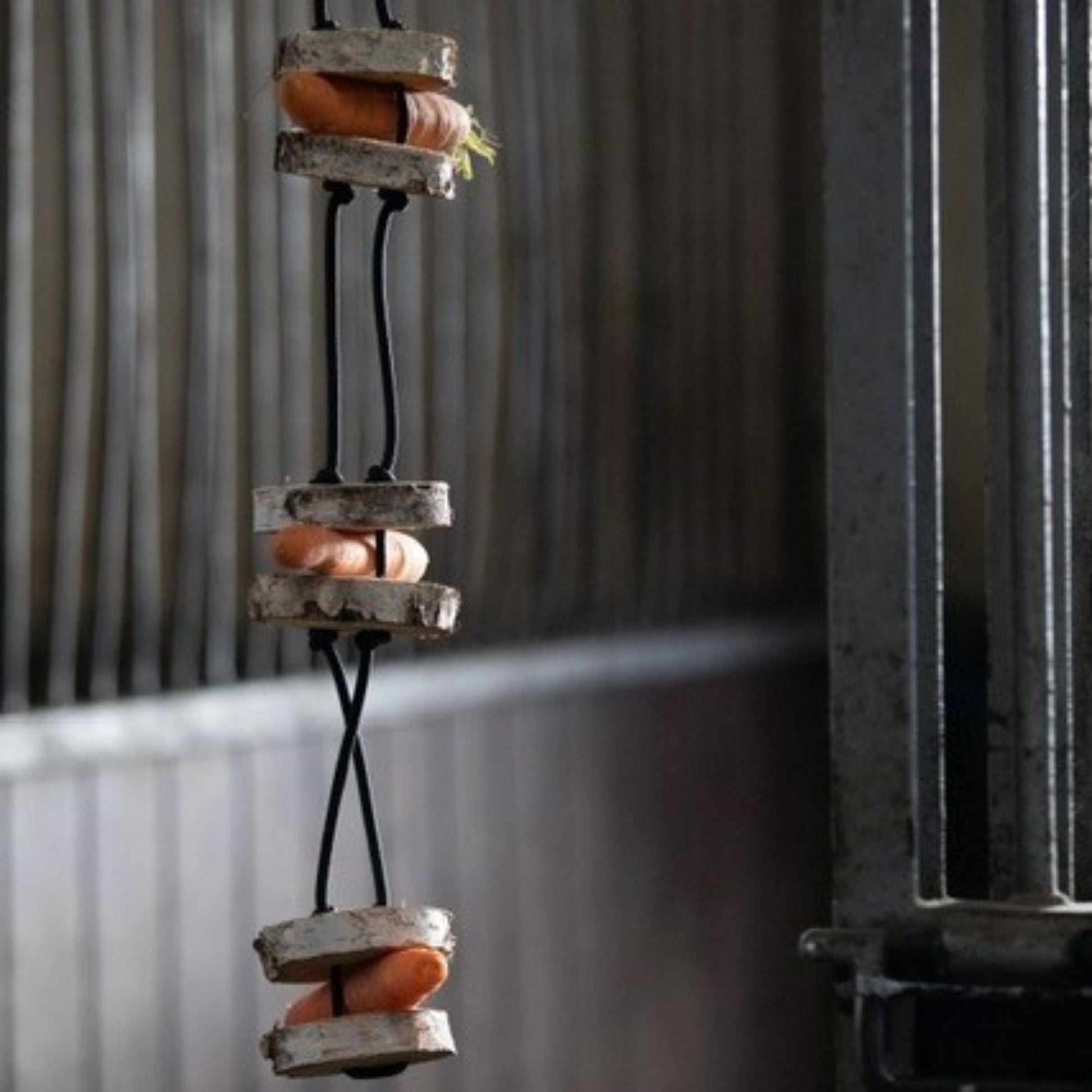 Durch die stabilen Expanderseile werden die Karotten, Apfelstücke oder Leckerlis sicher zwischen den Holzscheiben gehalten, sodass dein Pferd sich anstrengen muss, um sie herauszuziehen. Du kannst den Schwierigkeitsgrad individuell anpassen – nicht nur durch die Länge der Karotten, sondern auch dadurch, ob du das Pferdespielzeug freihängend anbringst. Ein frei aufgehängter Möhren-Tarzan sorgt für zusätzlichen Spaß und Herausforderung.