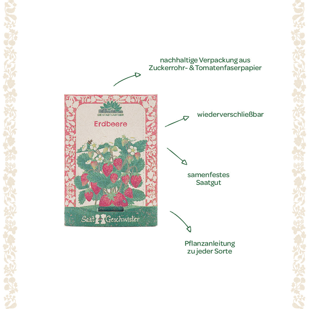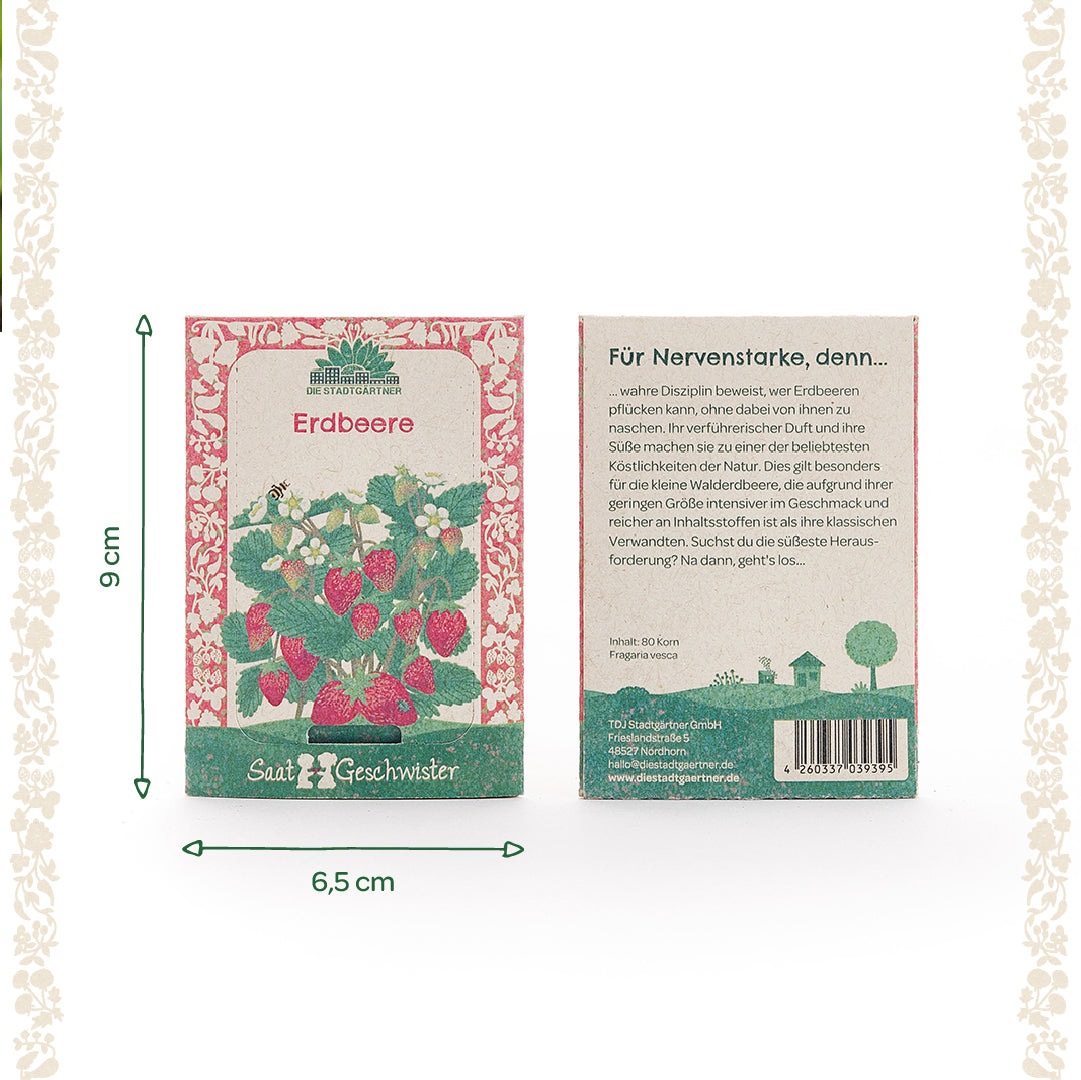 Nachhaltig verpackt: Das Erdbeersaatgut wird in einer liebevoll gestalteten Verpackung aus umweltfreundlichem Zuckerrohrpapier geliefert. Ideal für umweltbewusste Gärtner, die den intensiven Geschmack von Walderdbeeren aus eigener Anzucht genießen möchten. Perfekt für den Garten, Balkon oder Hochbeet.