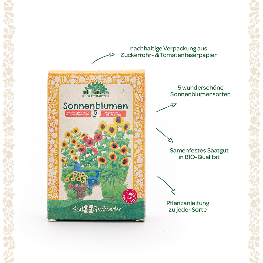 HOCHWERTIG: Für unser Saatgut-Set Sonnenblume verwenden wir ausschließlich hochwertiges Saatgut mit hoher Keimfähigkeit. Die Verpackung besteht aus nachhaltigem Zuckerrohrpapier. Sie sieht nicht nur toll aus, sondern eignet sich auch optimal zur Aufbewahrung des Saatguts.