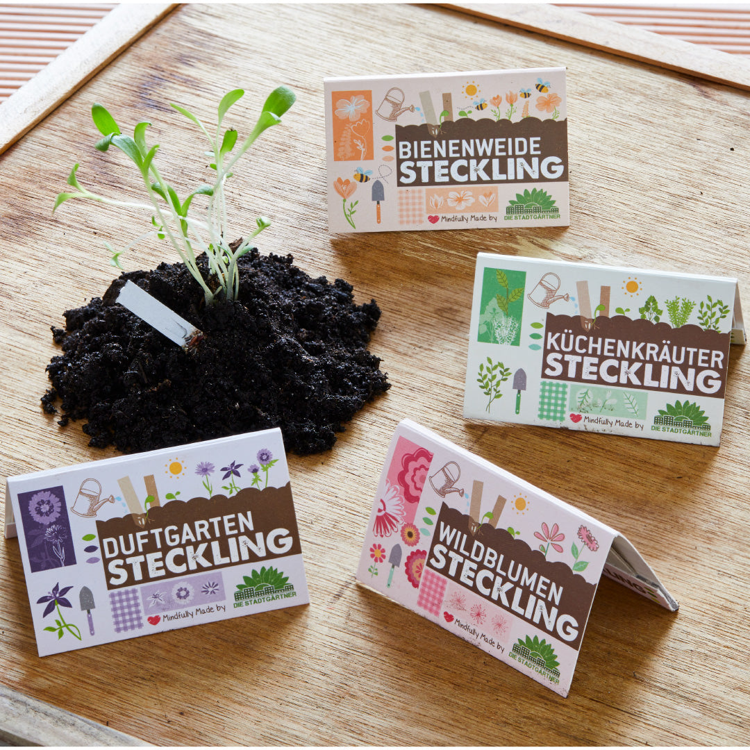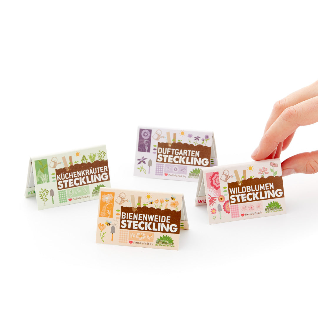 10 Pappstifte, an deren Spitze reichlich Saatgut angebracht ist. Das sind unsere Stecklinge. Das Komplettpaket beinhaltet vier verschiedenen Sorten: Bienenweide, Wildblumen, Kräuter und Duftgarten und macht deine Welt (und deinen Balkonkübel) im Handumdrehen kunterbunt.
