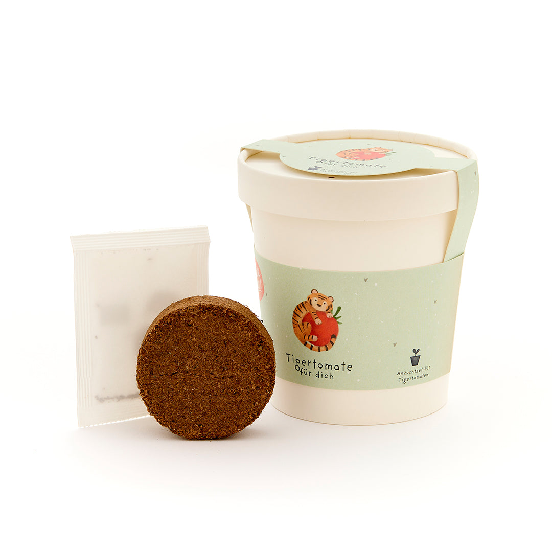 Alles drin für gestreifte Tomatenliebe: Das Set enthält Tigertomaten-Saatgut, eine Kokos-Quelltablette, einen Anzuchtbecher und eine Anleitung. In nur wenigen Schritten wächst aus dem Set ein fruchtiger Pflanzengruß – auf der Fensterbank, im Büro oder auf dem Balkon.