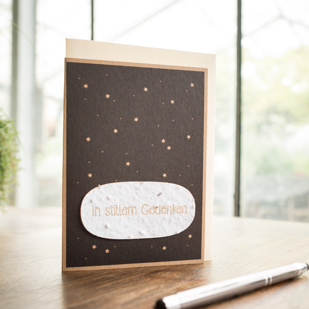 Die Karte ist schlicht und klassisch gestaltet und hat, wie alle unsere Karten, einen integrierten Blumenstrauß. Die angeheftete Wolke besteht aus handgeschöpftenm Saatpapier. In einem Blumentopf löst die Wolke sich in Blumen auf und spendet so Trost und Hoffnung.