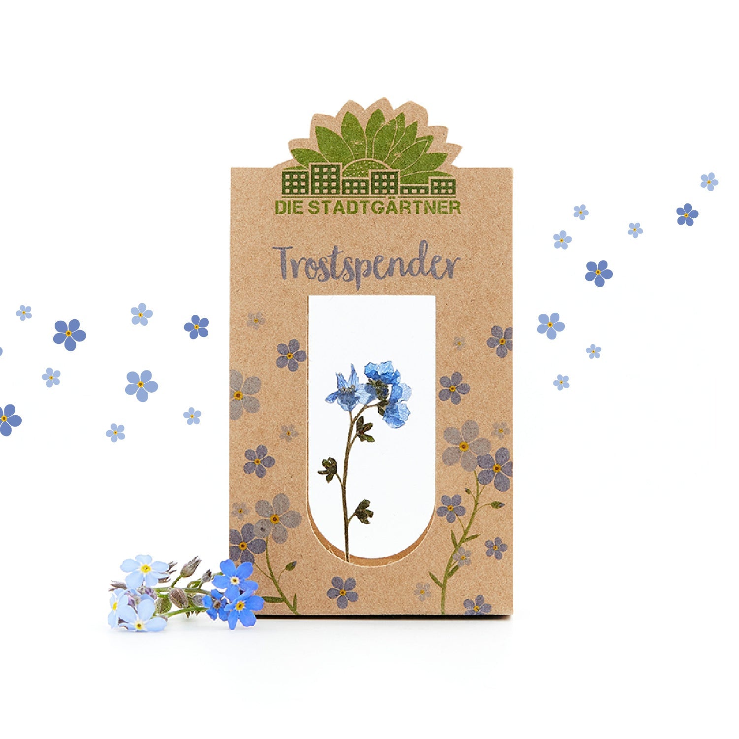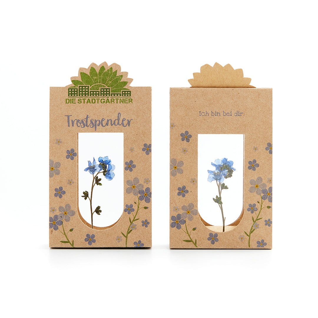 Für den Trostspender haben wir kleine blaue Vergissmeinnicht liebevoll zwischen zwei Glasscheiben konserviert. Die blaue zarte Pflanze trägt ihre Bedeutung schon im Namen. Das Vergissmeinnicht symbolisiert seit jeher Liebe, Treue und Zusammengehörigkeit. Ein schönes Symbol für Momente, in denen Worte manchmal einfach fehlen.
