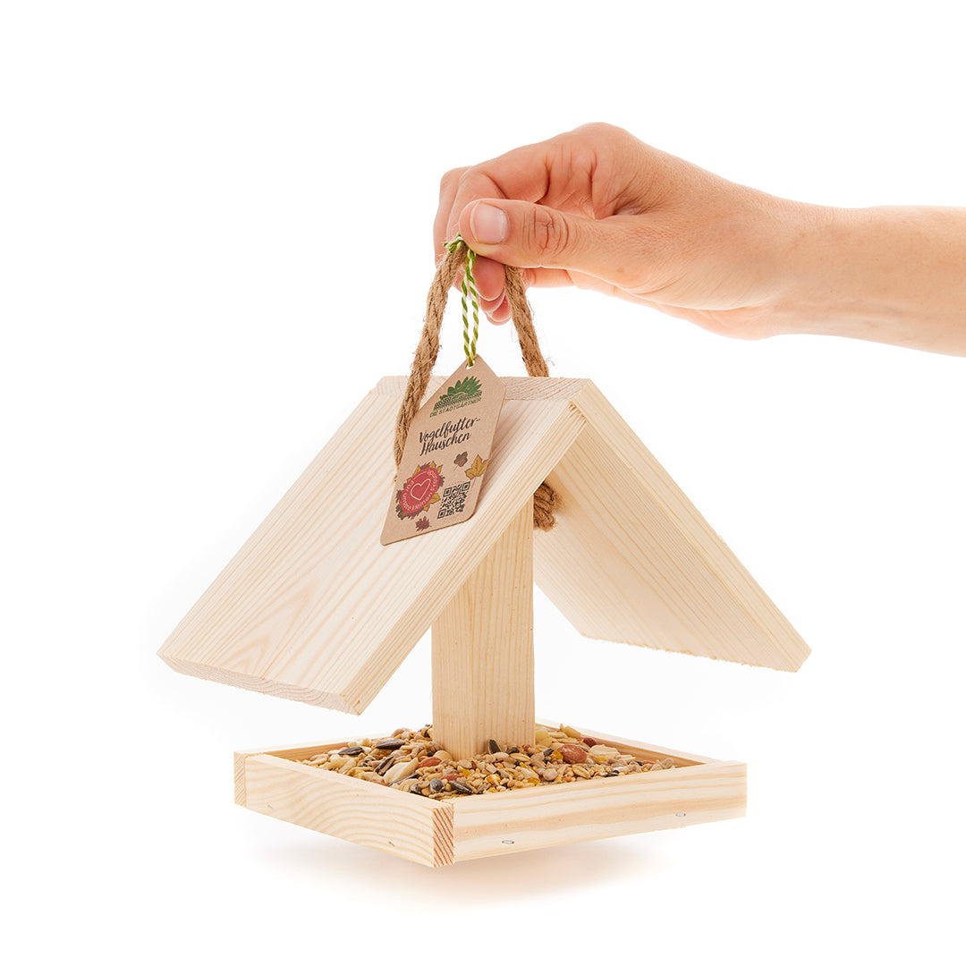 Das Vogelfutterhäuschen ist Natur pur: Es besteht aus 100% unbehandeltem Holz aus europäischen Wäldern. Um lange Freude daran zu haben, hänge das Häuschen am besten an einem geschützten Ort auf.